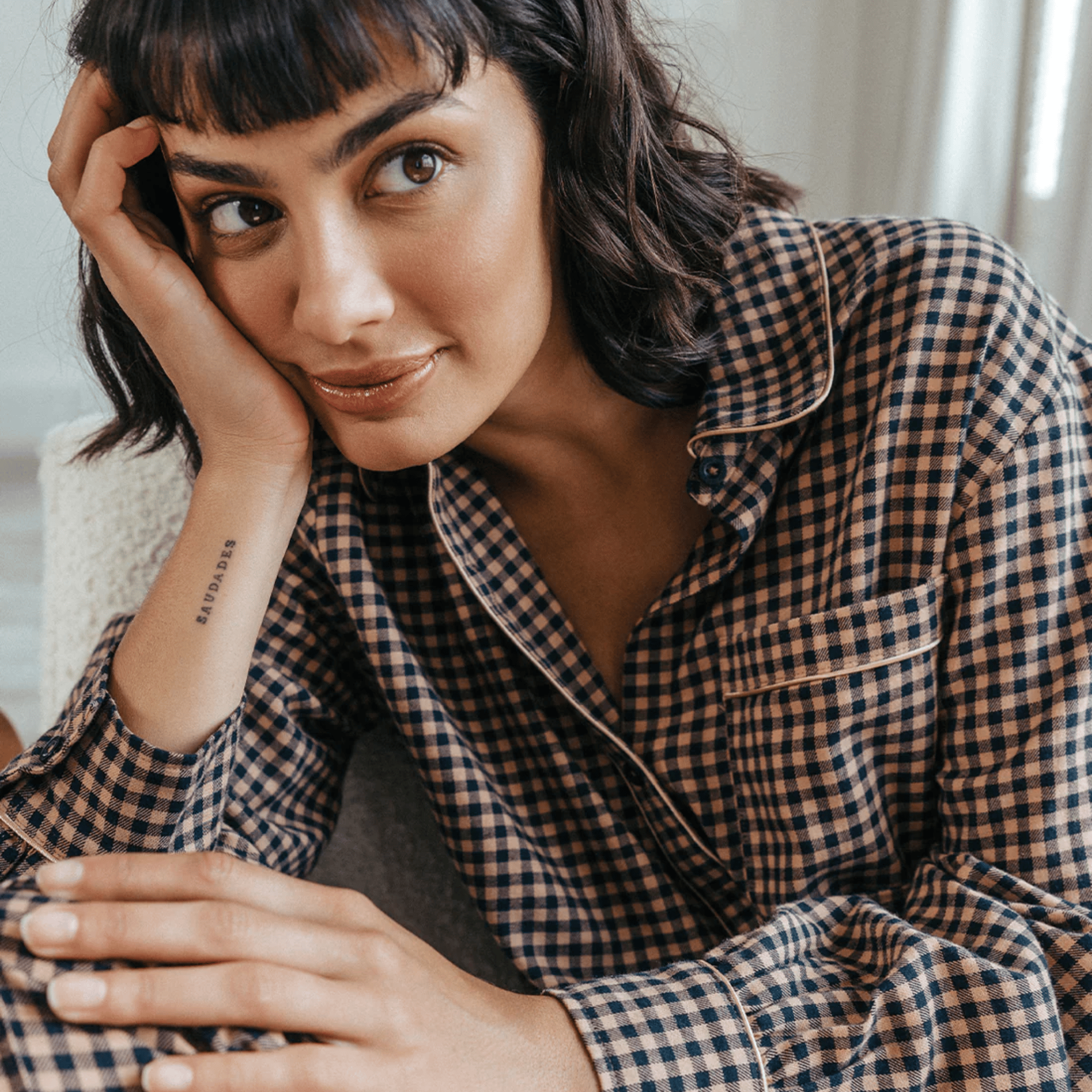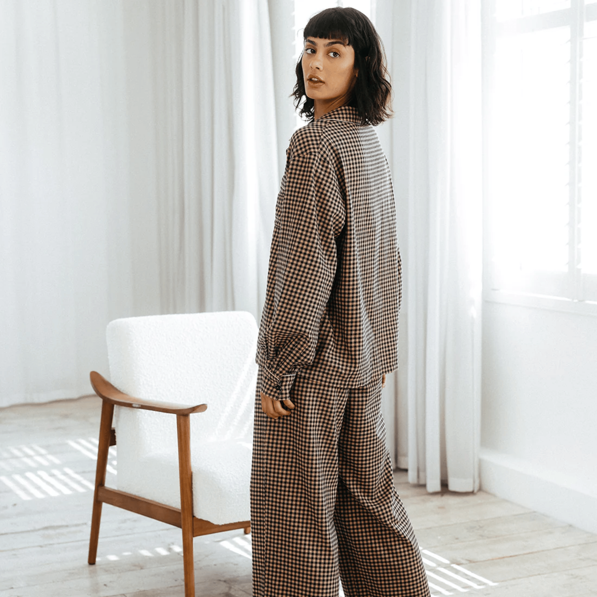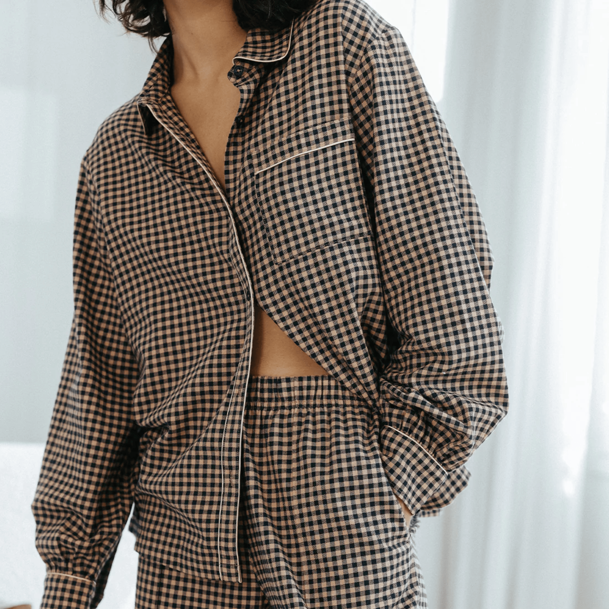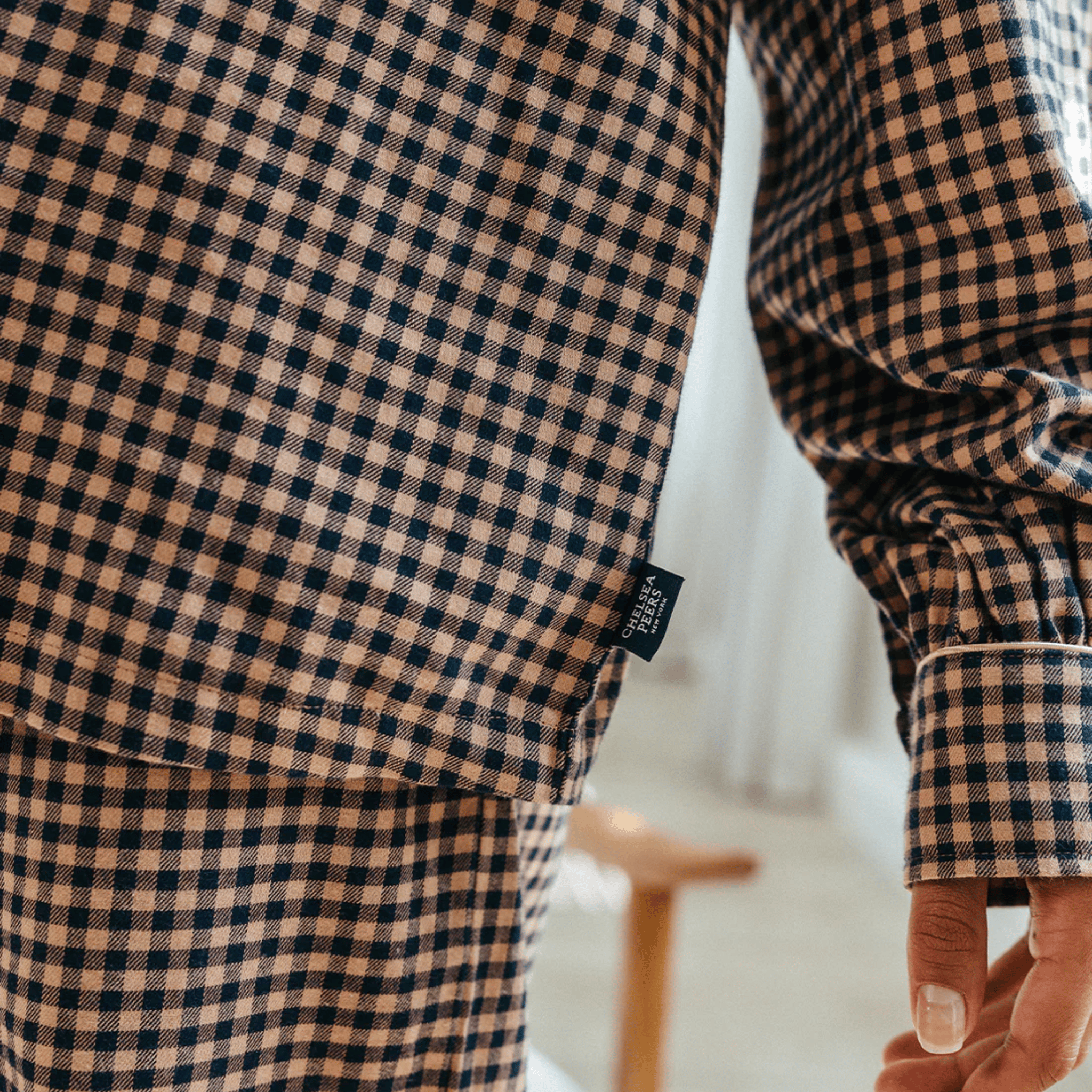 These cool, cozy and contemporary Brown Gingham pajamas are are almost too good to wear to bed! The organic cotton classic button-up shirt and straight leg pants feature contrast piping and side pockets in refined brown and black gingham checks. The ultimate upgrade to your wind-down time.