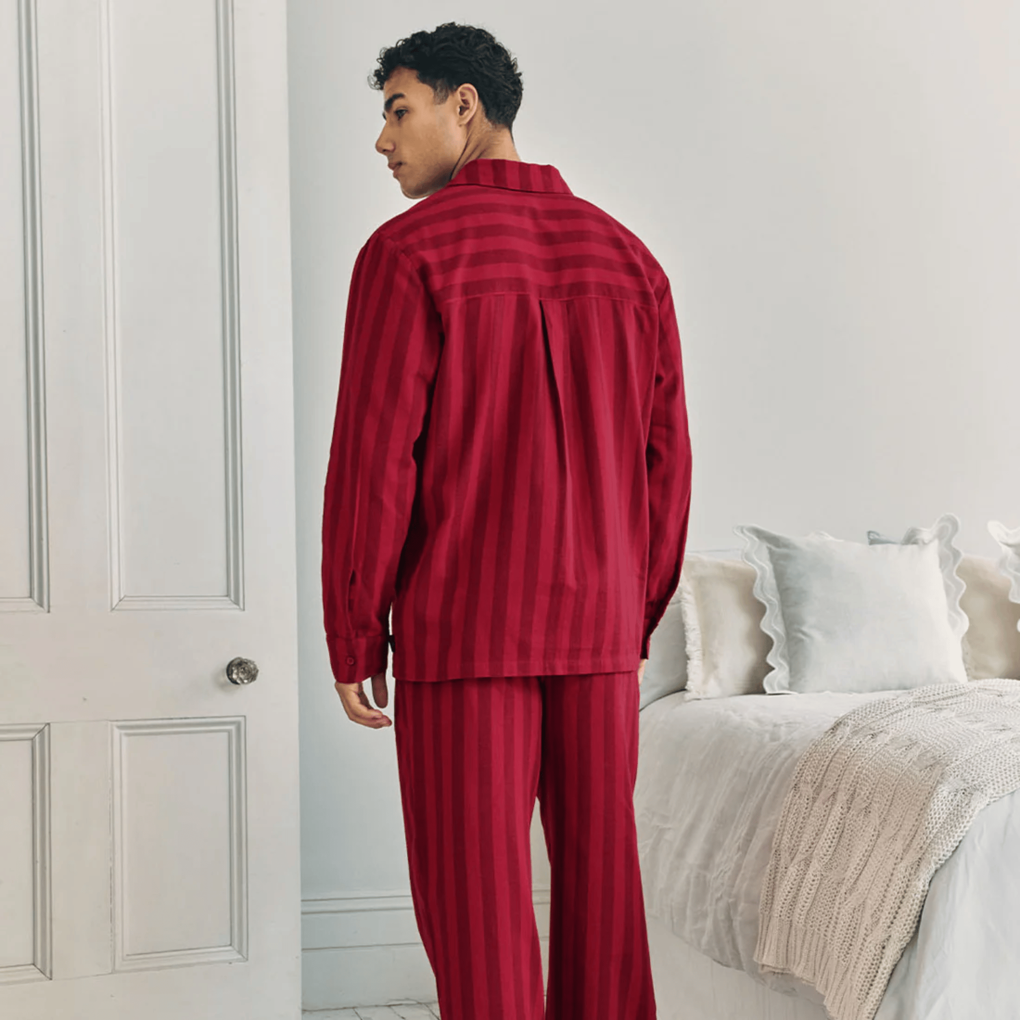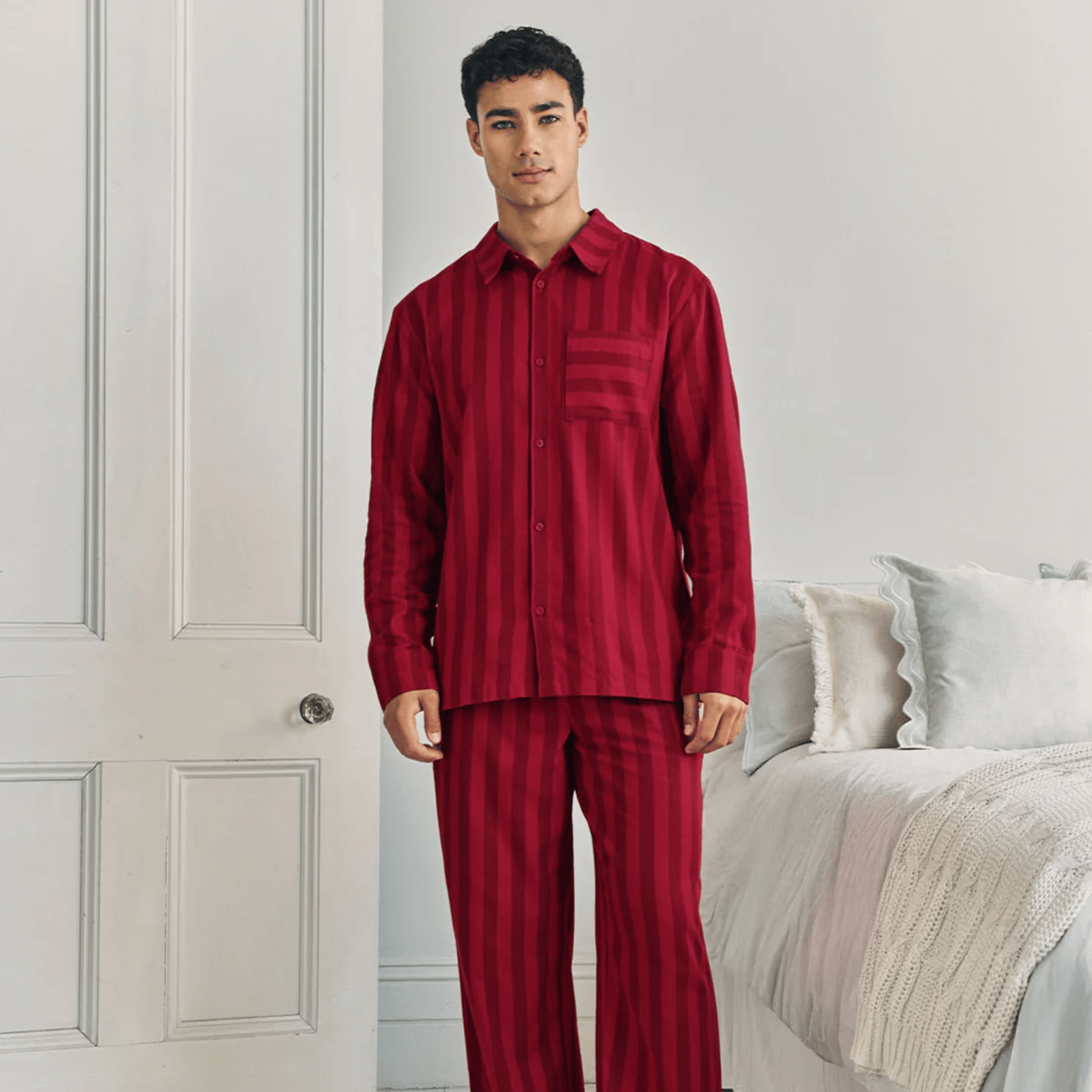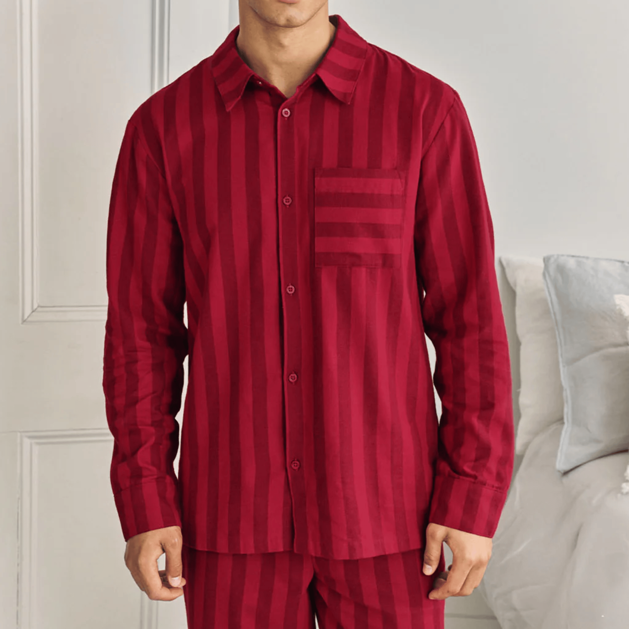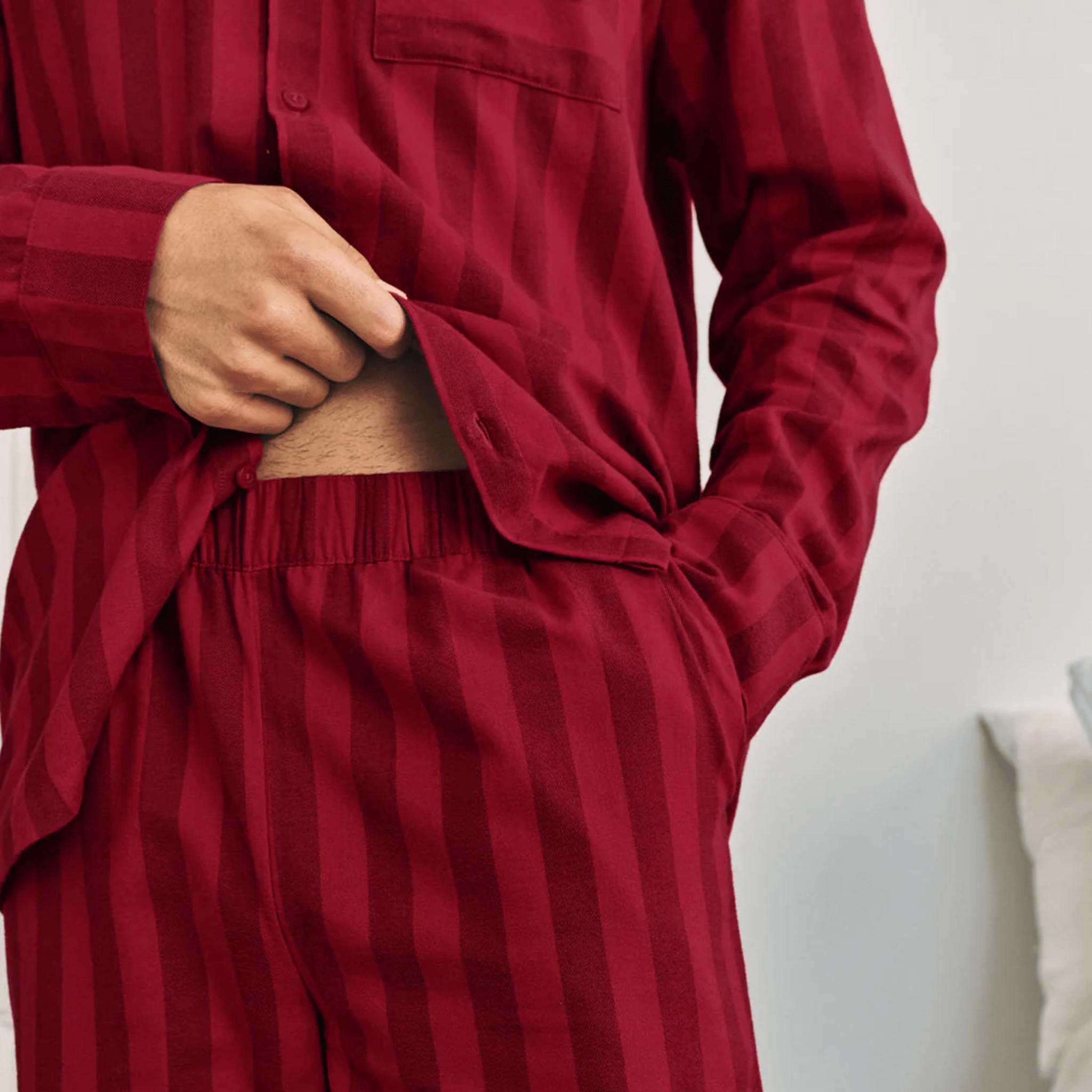 Cut in brushed cotton flannel, these red-on-red striped pyjamas bring timeless charm to Christmas lounging. The set features a button-up shirt finished with a single chest pocket in contrasting horizontal stripes, while the bottoms have a comfy elasticated waistband and side pockets. Crafted entirely from certified organic cotton, this set blends festive tradition with year-round wearability, a polished choice for Christmas morning, and for long, lazy weekends afterwards.