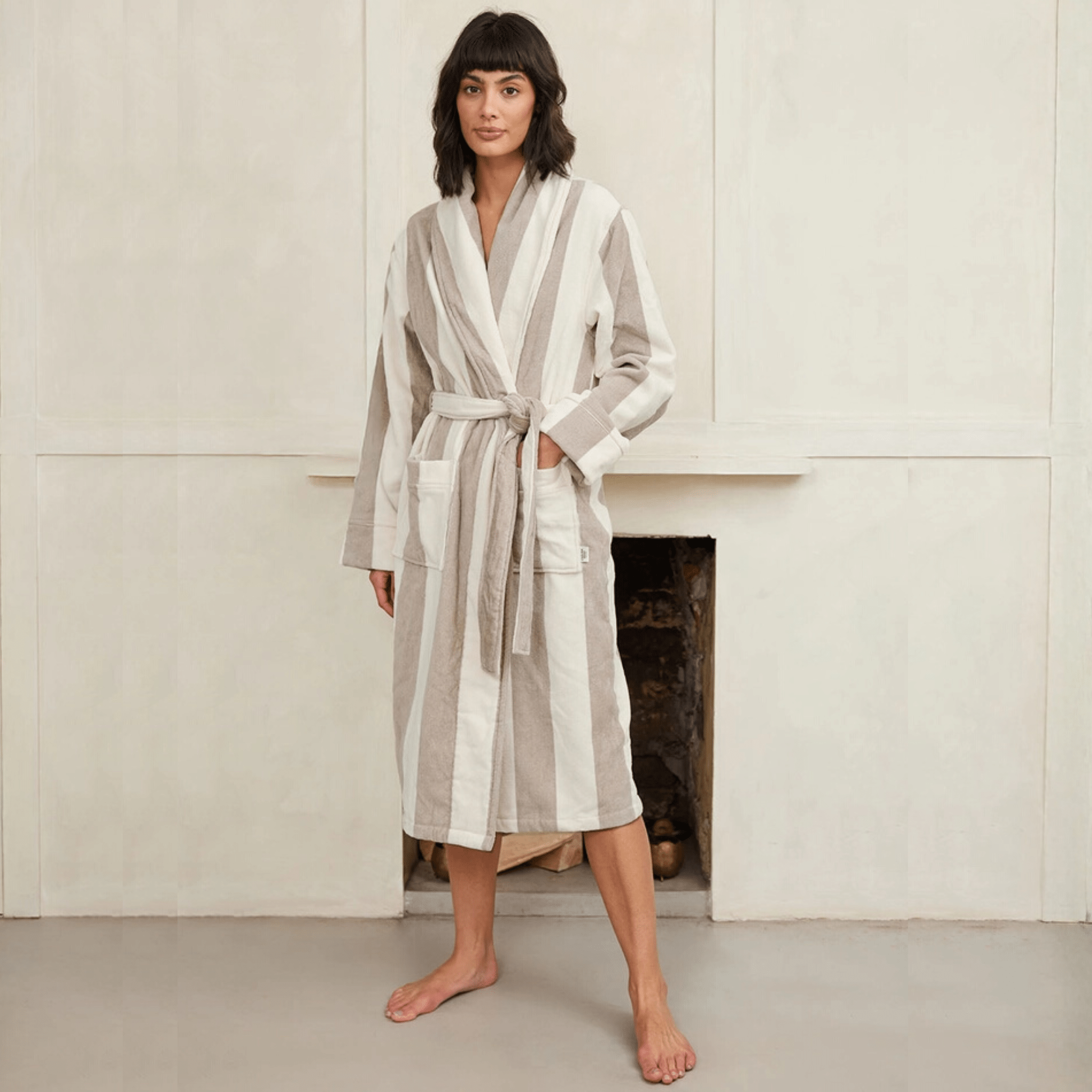 Take your weekend lounging to new heights of comfort! Classically elegant, the Taupe Stripe Robe is crafted from luxurious cotton towelling. Soft, plush and absorbent with a collar neckline and long self tie belt, this robe is easy to slip on straight out of the shower or while getting ready. Makes a perfect gift!