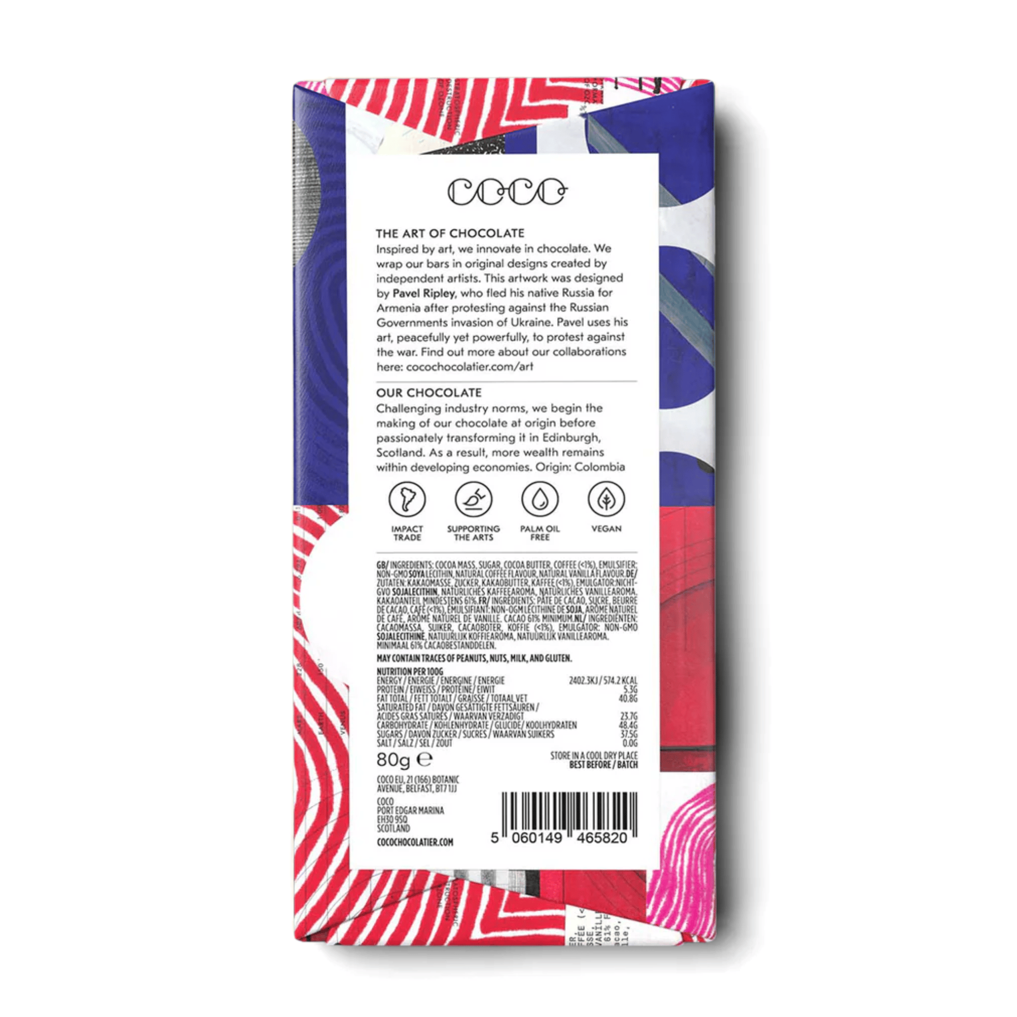COCO Chocolatier Cold Brew Coffee Dark Chocolate Bar is rich and energising, with deep Colombian cacao meeting the bold complexity of locally roasted cold brew coffee. Crafted with 61% single-origin dark chocolate, this balanced bar delivers sweet cocoa depth with invigorating notes of coffee, blood orange, caramel and nutty undertones. Wrapped in artist-designed packaging, it’s a luxurious choice for gifting or savouring.