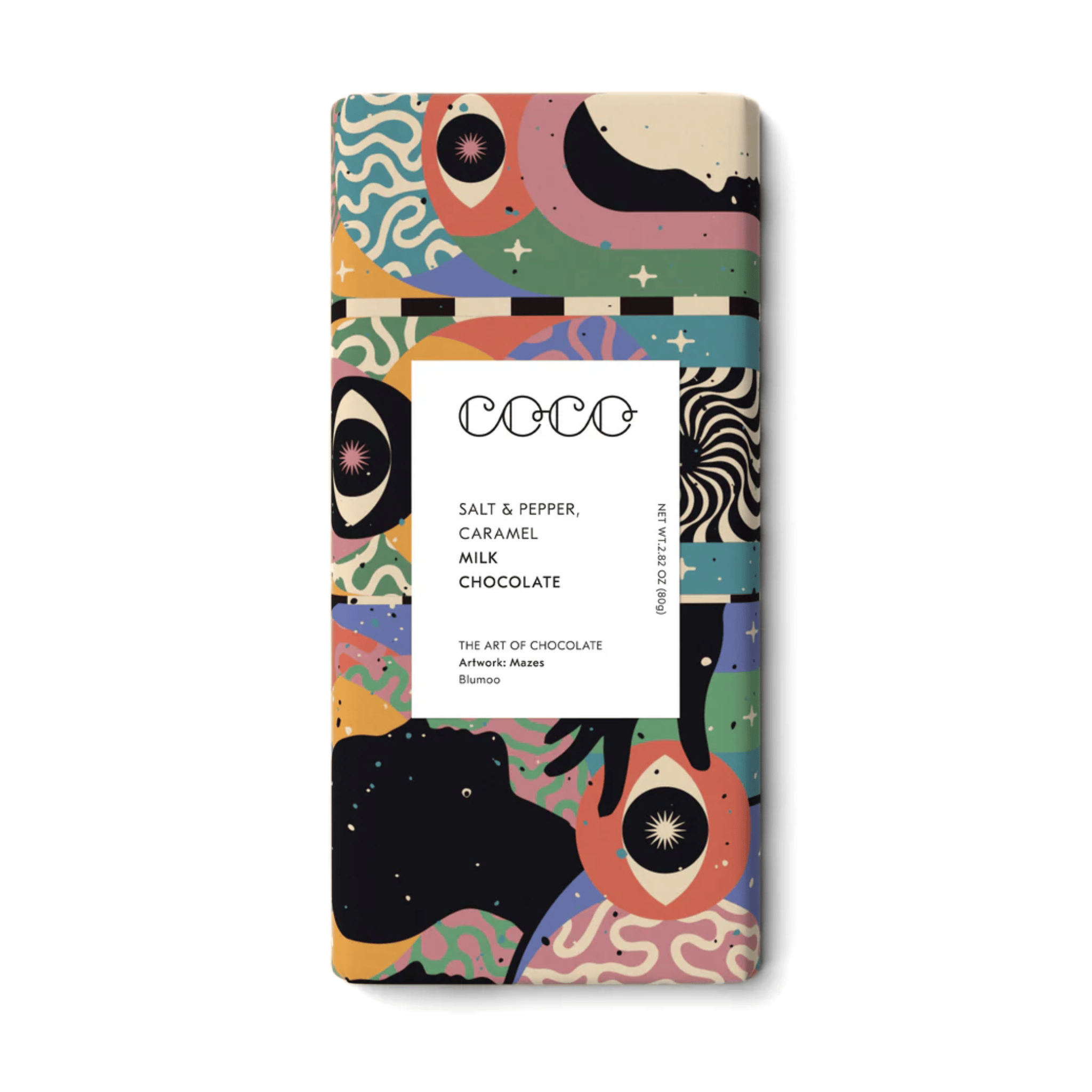 A surprising and delightful combination, the COCO Chocolatier Salt & Pepper Caramel Milk Chocolate Bar blends 40% Colombian milk chocolate with crunchy caramel, a hint of salt and warm notes of cracked black pepper. The unique sweet, savoury and slightly spicy flavour journey evolves with every bite! Wrapped in eye-catching contemporary artwork by artist Blumoo.