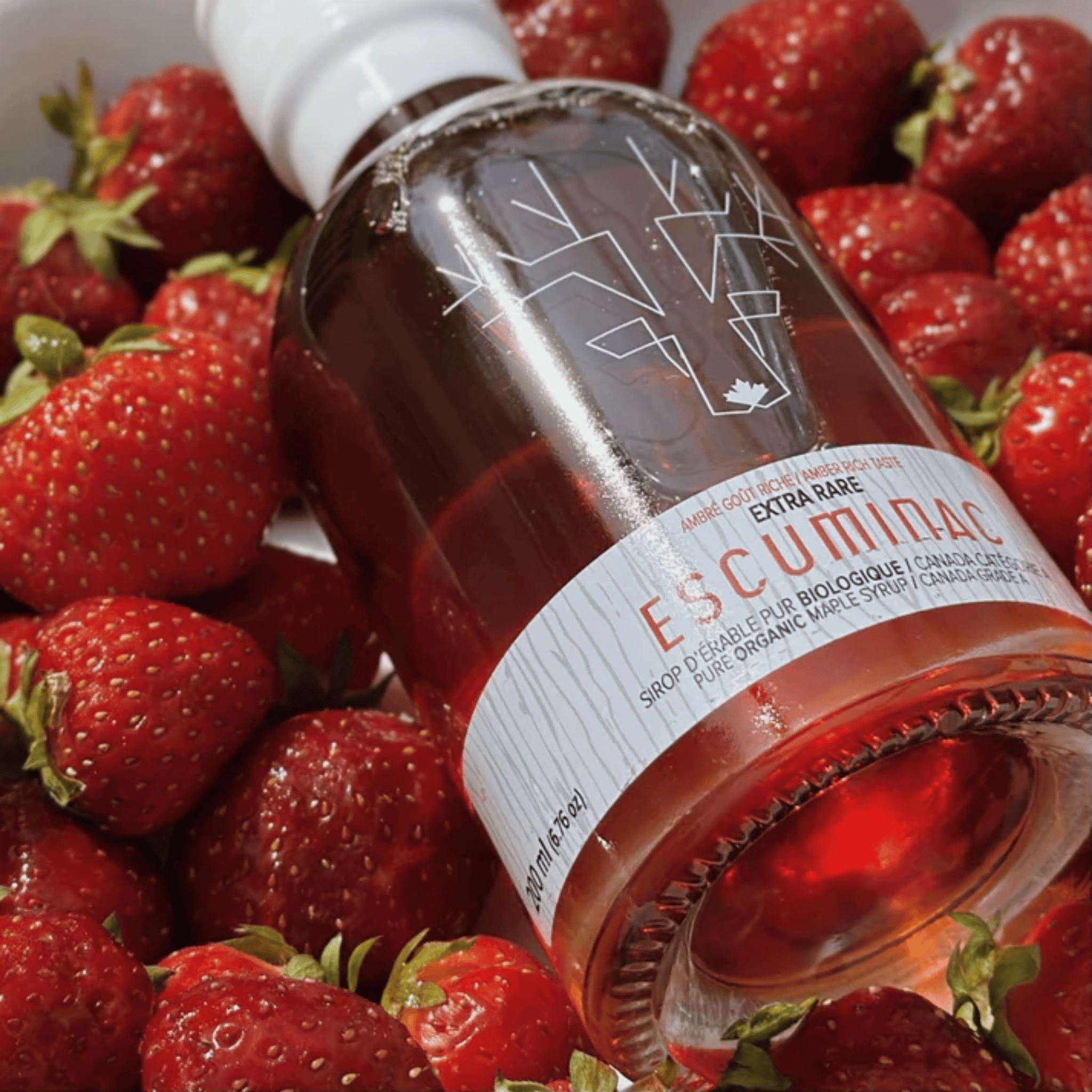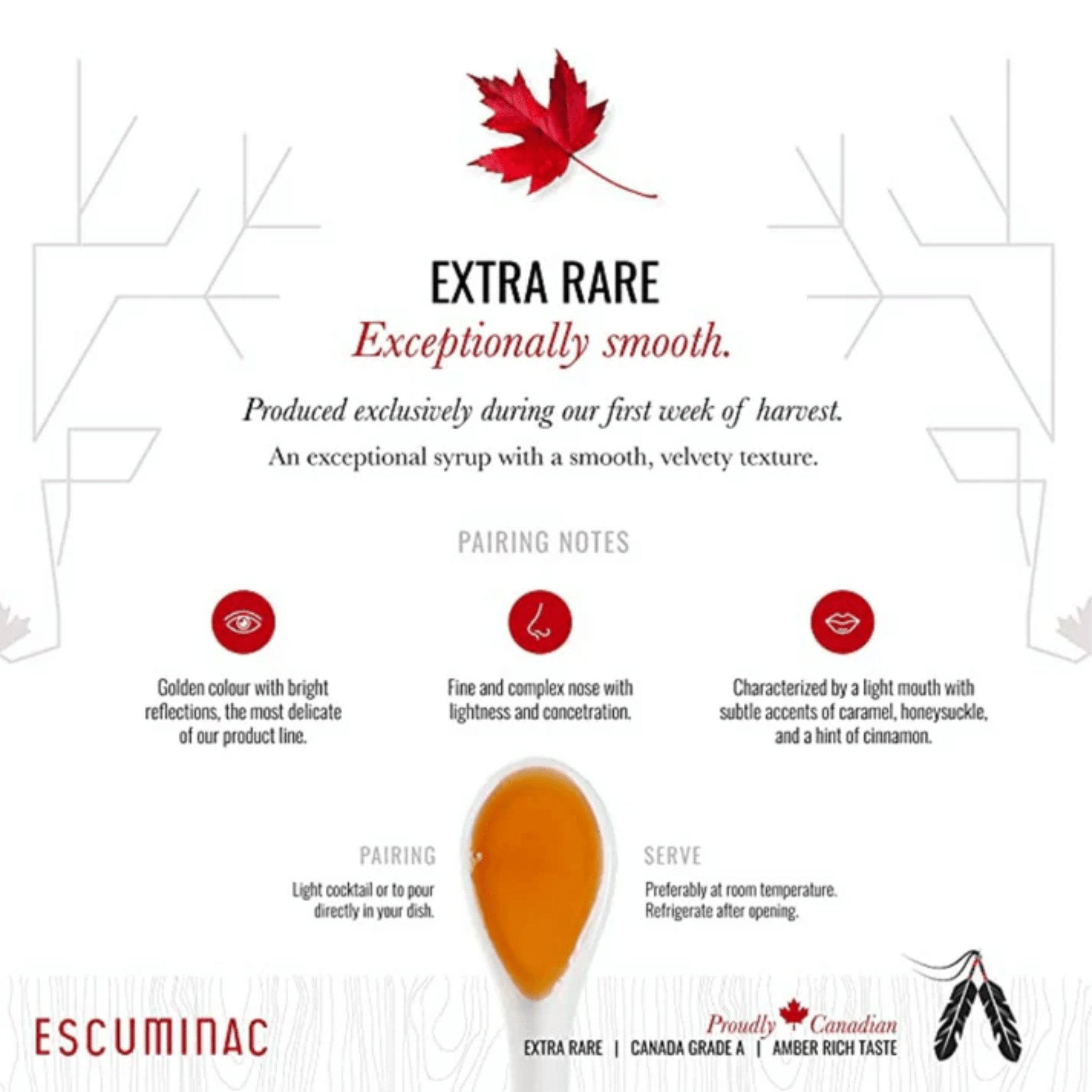 A celebration of artisanal maple syrup, Escuminac Extra Rare Organic Maple Syrup is a light and delicately sweet expression of Quebec’s first sap run. Golden and velvety, it wraps subtle caramel and honeysuckle notes with a whisper of cinnamon into a long, lingering finish, making every drizzle feel intentional. Crafted in small batches from pure, traceable Canadian maple sap with zero additives, it brings elegant sweetness and complexity to pancakes, desserts, cocktails or savoury glazes.