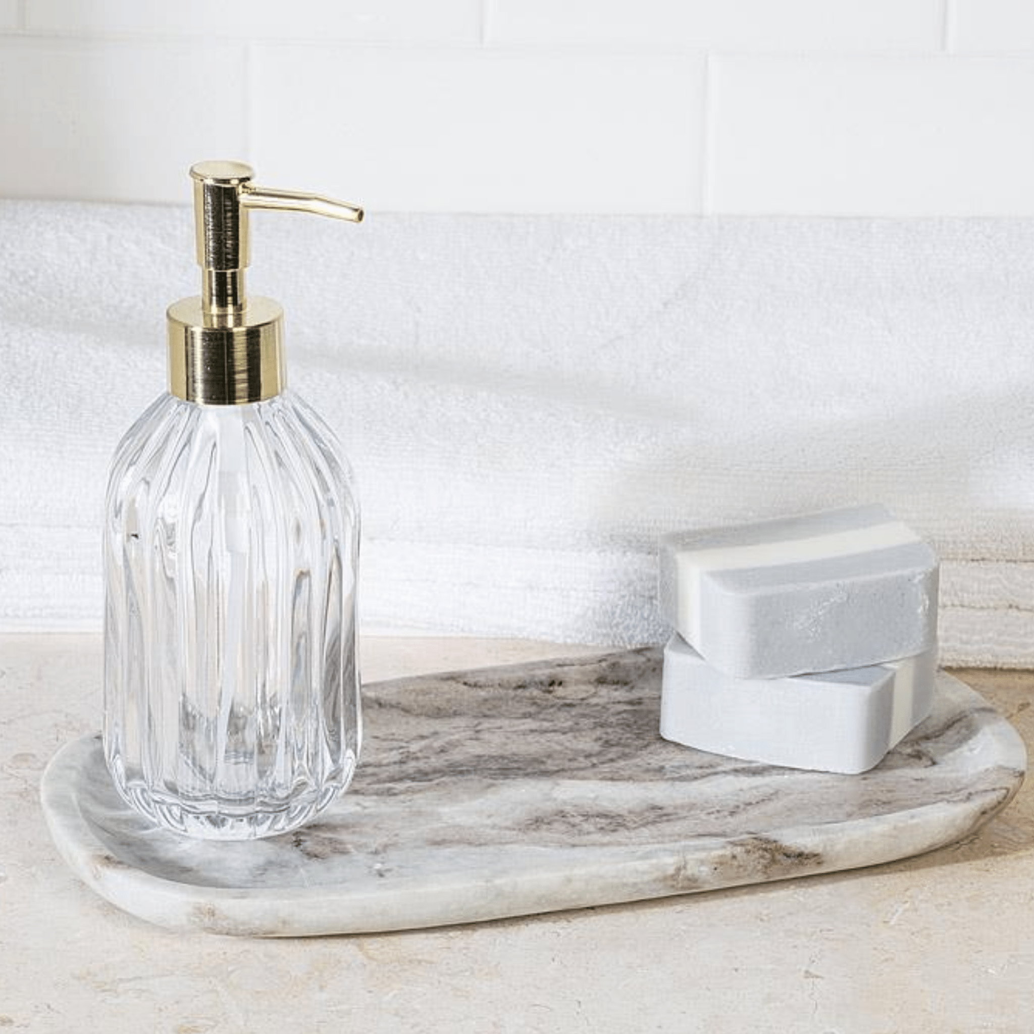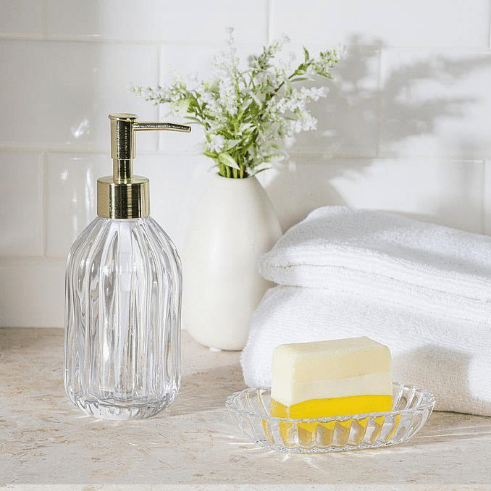 Add a touch of Art Deco flair to your bathroom or kitchen with the elegant Fluted Soap Pump. Casually glam, with gold finishings and thick, fluted glass base, tthis pump is more than a pretty face! The clear glass allows you to see when it's time to refill, no guesswork involved.