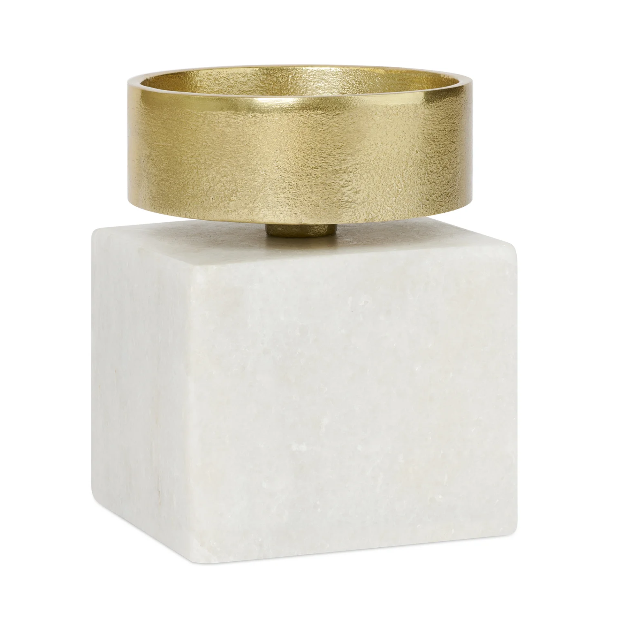 Add a modern, geometric touch your décor with this refined gold pillar candle holder featuring a marble base and polished nickel plated aluminium top. Its refined shape brings a modern touch to tabletops, mantles, shelves or side tables while providing a stable perch for your favourite pillar candle.