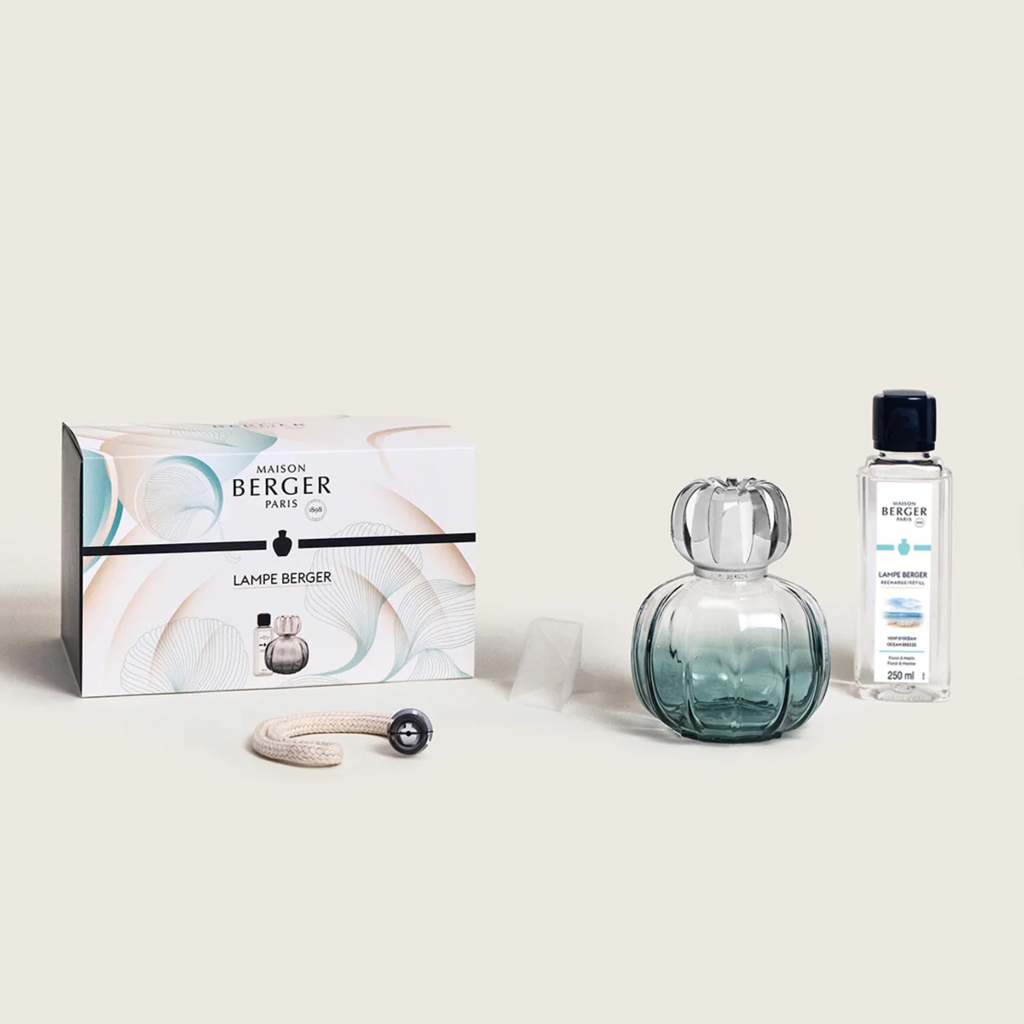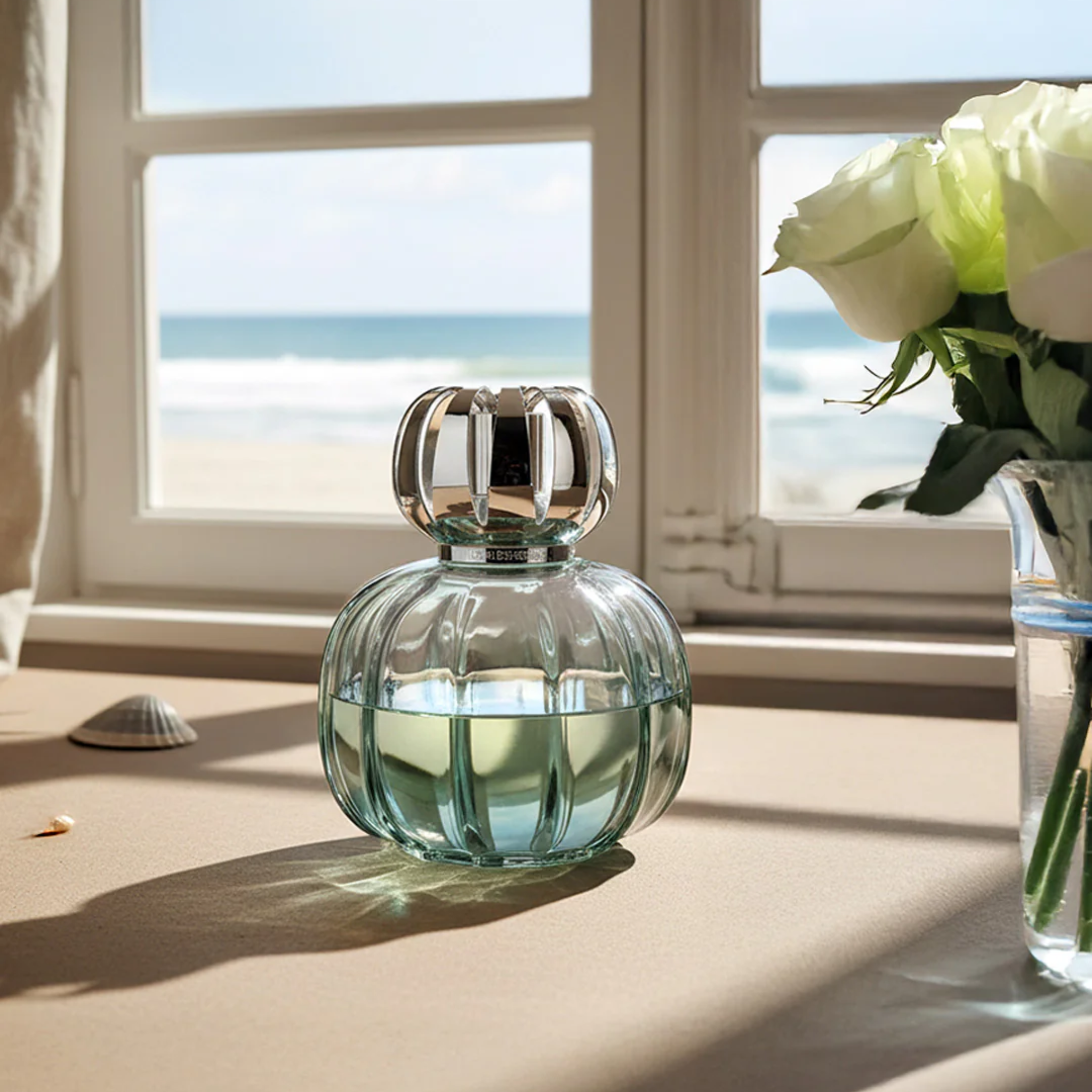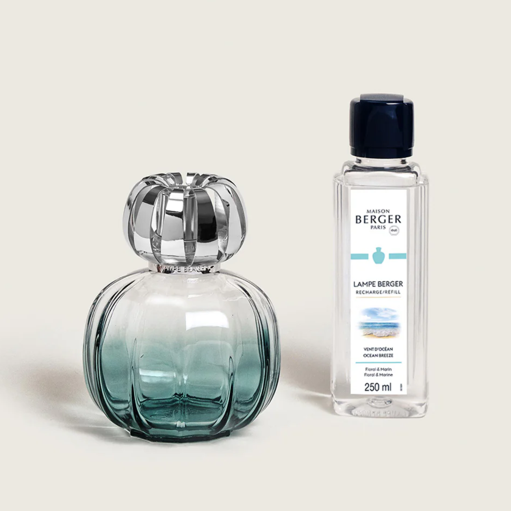 Bring fresh style and uplifting scent to your space with this Corali Green fragrance lamp gift set. The elegant peacock green lacquered glass design adds colour and character to your décor while the included Ocean Breeze fragrance fills the room with a bright, seaside scent.