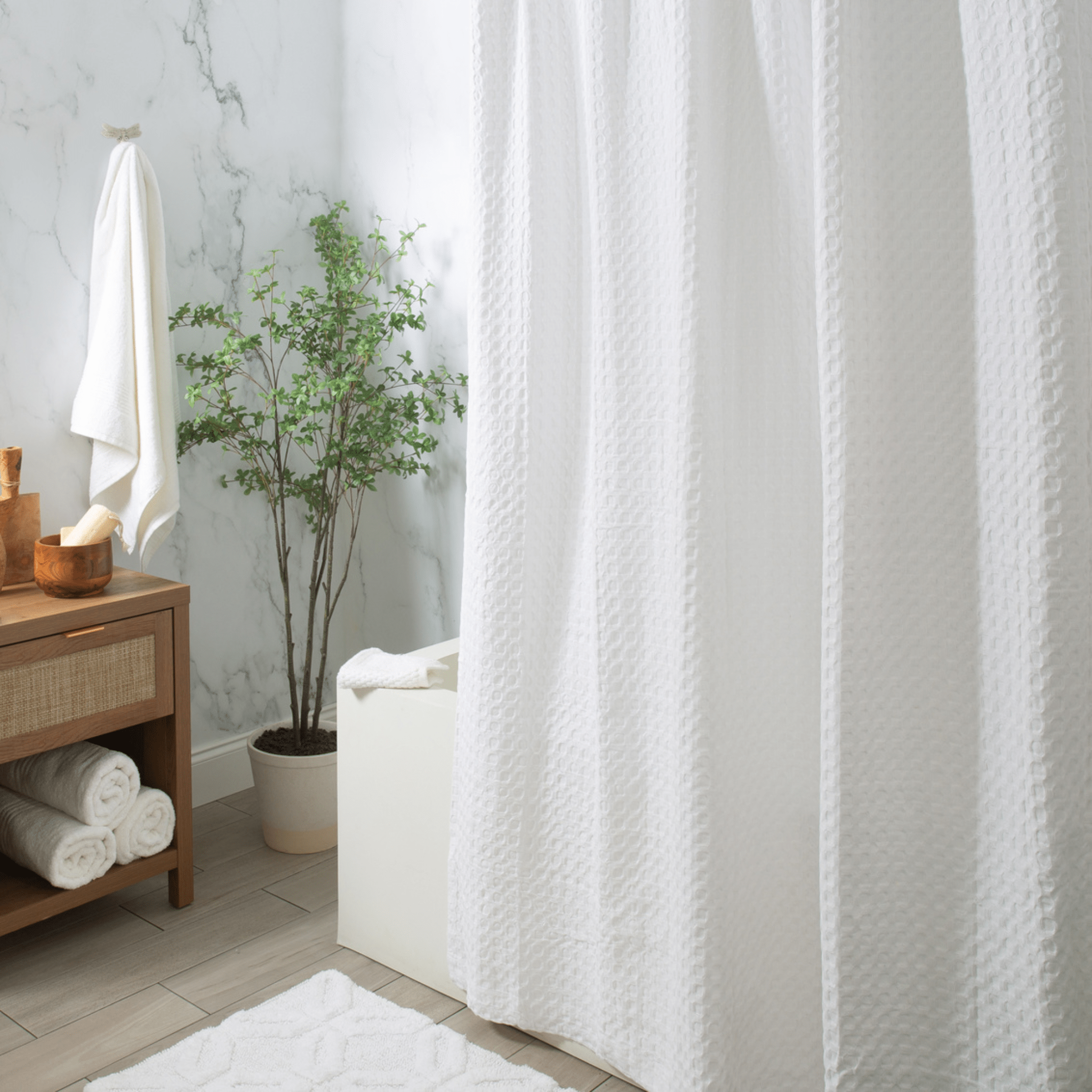 The Chunky Waffle curtain from Moda at Home adds a touch of luxury and contemporary flare to your bathroom. The deep texture of the fabric brings a warmth and spa-like feel to your room. Available in crisp white and warm grey, the waffle weave is an instant bathroom classic.