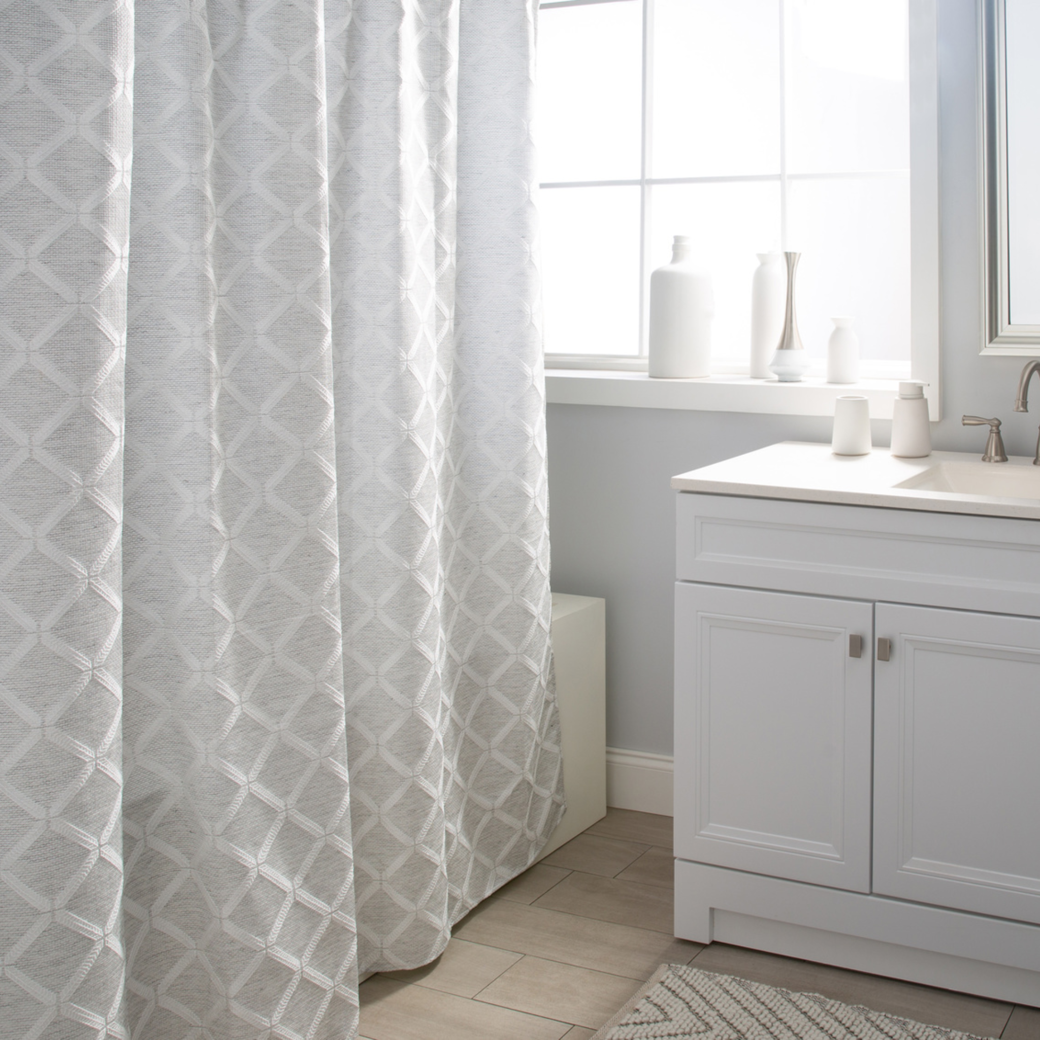 Elevate your bathroom with the subtle elegance of the Linden shower curtain. Its soft grey and white jacquard pattern adds beautiful texture and a refined touch, creating a calm and polished look. Effortlessly stylish, it’s a simple way to give your space a graceful refresh.