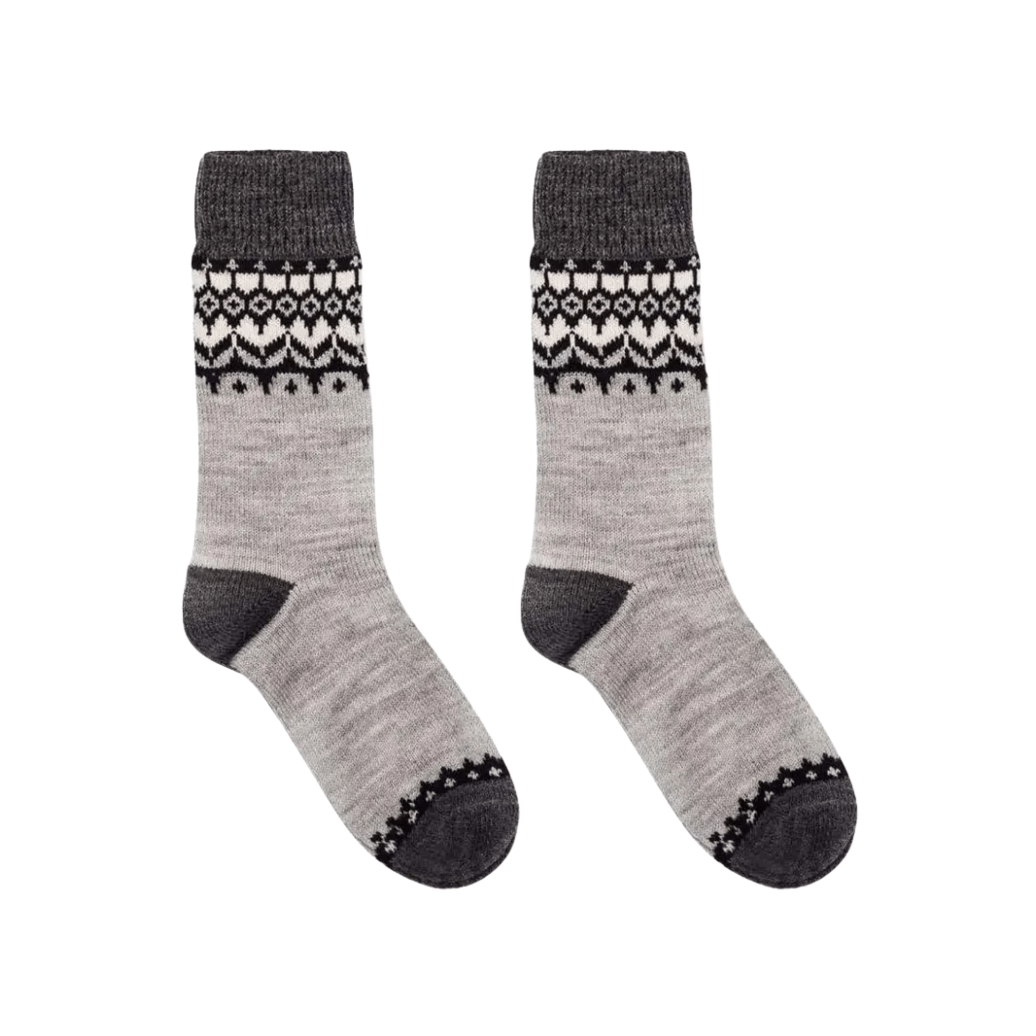 Cozy up to winter in Nordic Wools Jorunn Ash socks. A blend of Merino wool, acrylic and polyamide in a cozy grey knit with a black and white Scandi-inspired border, these socks are a treat for your feet! Merino wool for temperature regulation and moisture absorption. Acrylic for extra softness so you don't feel any itch from the wool. Polyamide used for reinforced heels and toes for increased strength and durability.