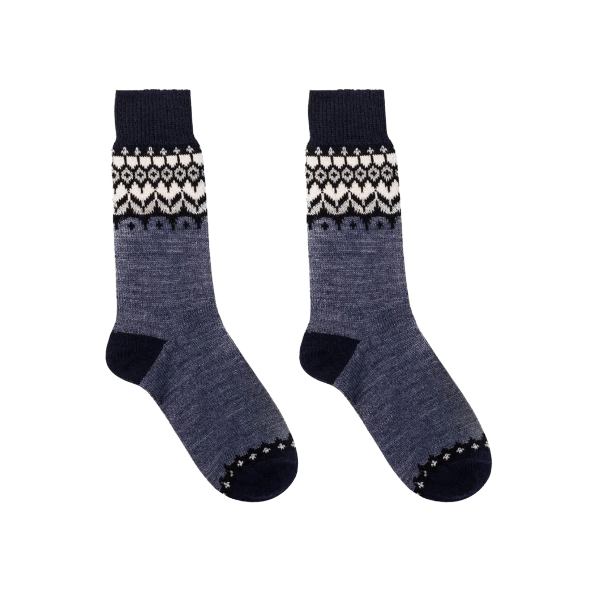 Your winter feet will feel a little bit warmer in Nordic Wools Jorunn Denim socks! A blend of Merino wool, acrylic and polyamide in a cozy grey knit with a denim blue, black and white Scandi-inspired border, these socks are a treat for your feet! Merino wool for temperature regulation and moisture absorption. Acrylic for extra softness so you don't feel any itch from the wool. Polyamide used for reinforced heels and toes for increased strength and durability.