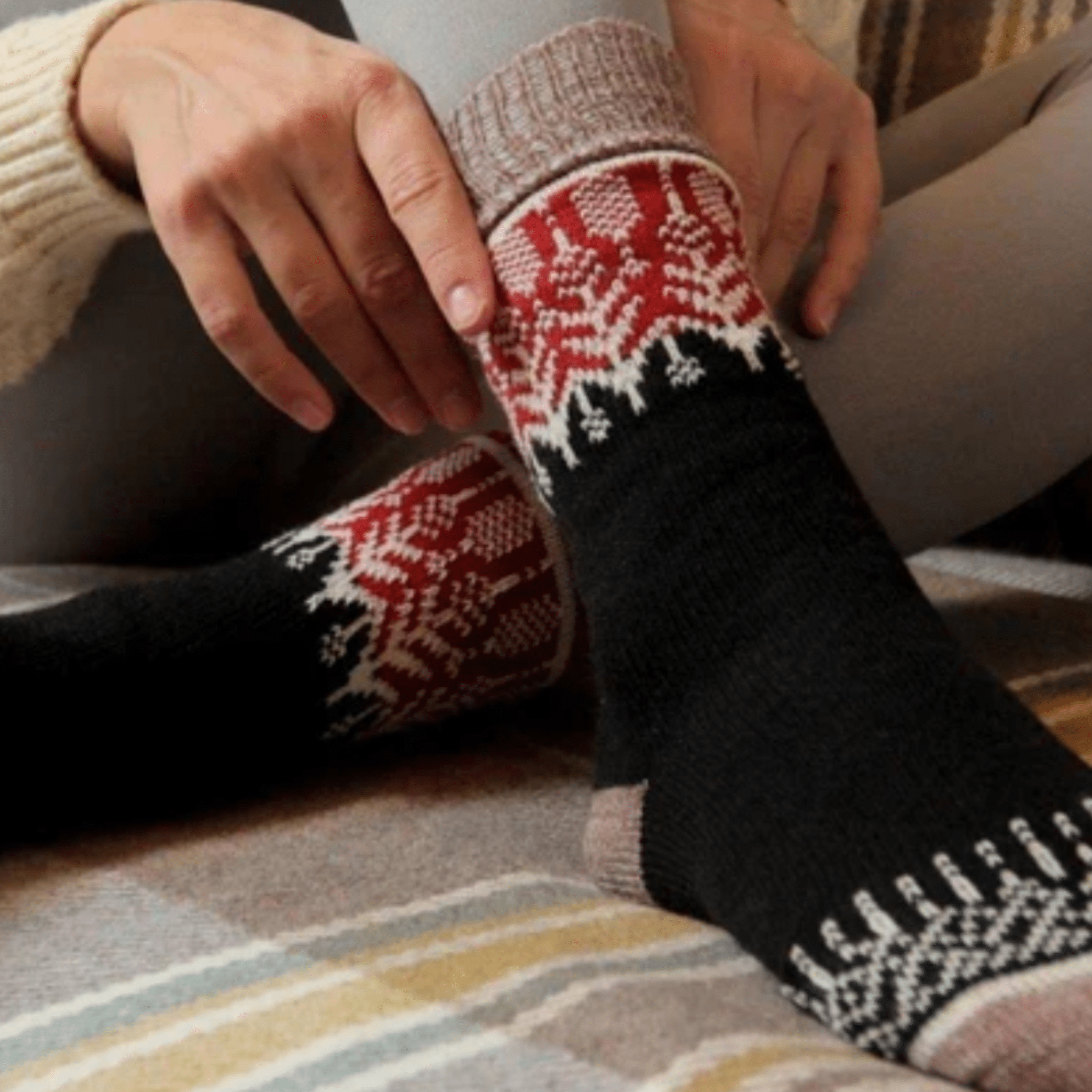 The Yule Sunset socks from Nordic Wools will keep your feet toasty warm on the slopes or a hike! A super-soft blend with a natural Scandi-inspired pattern in warm shades of black, pink and red. Merino wool for temperature regulation and moisture absorption. Acrylic for extra softness so you don't feel any itch from the wool. Polyamide used for reinforced heels and toes for increased strength and durability.