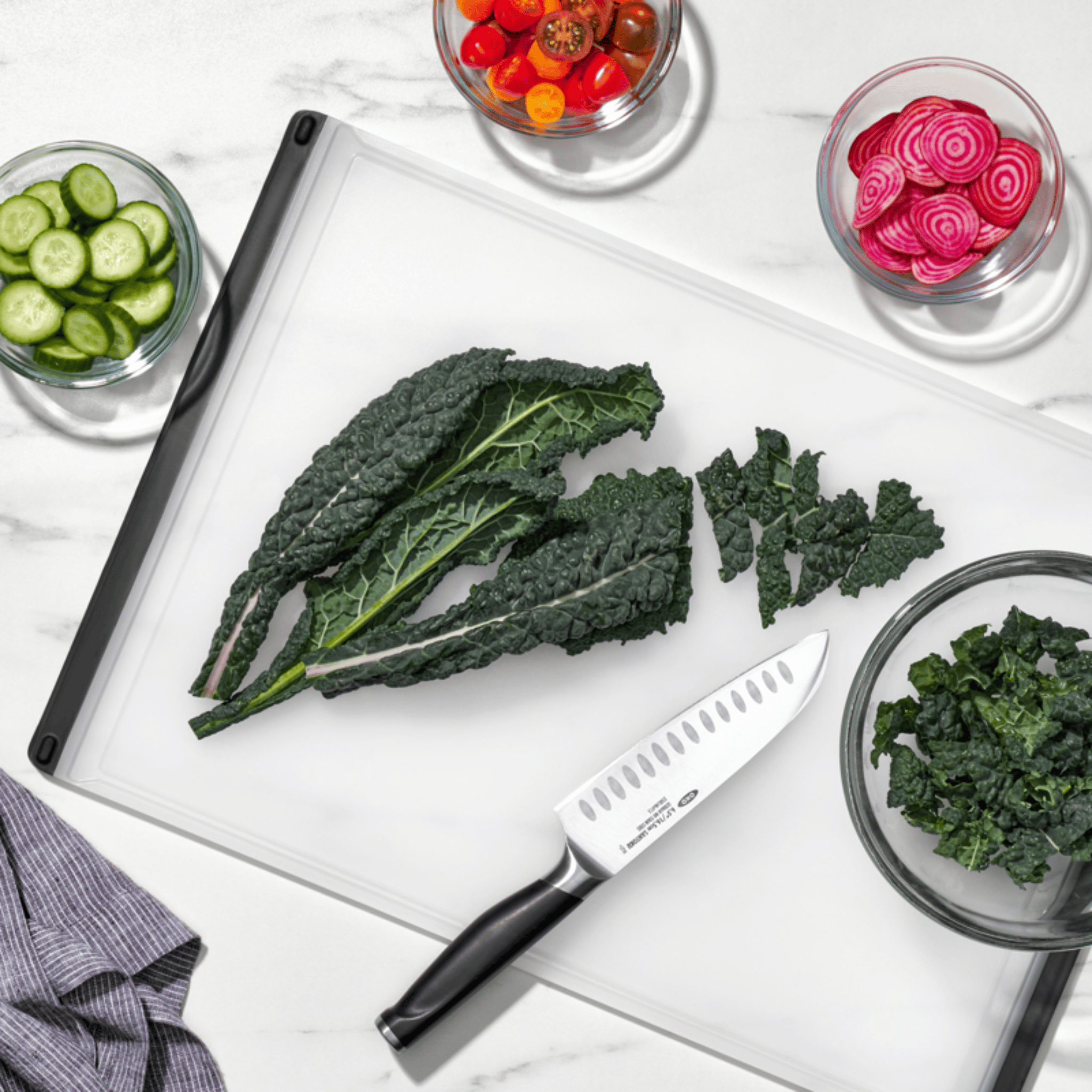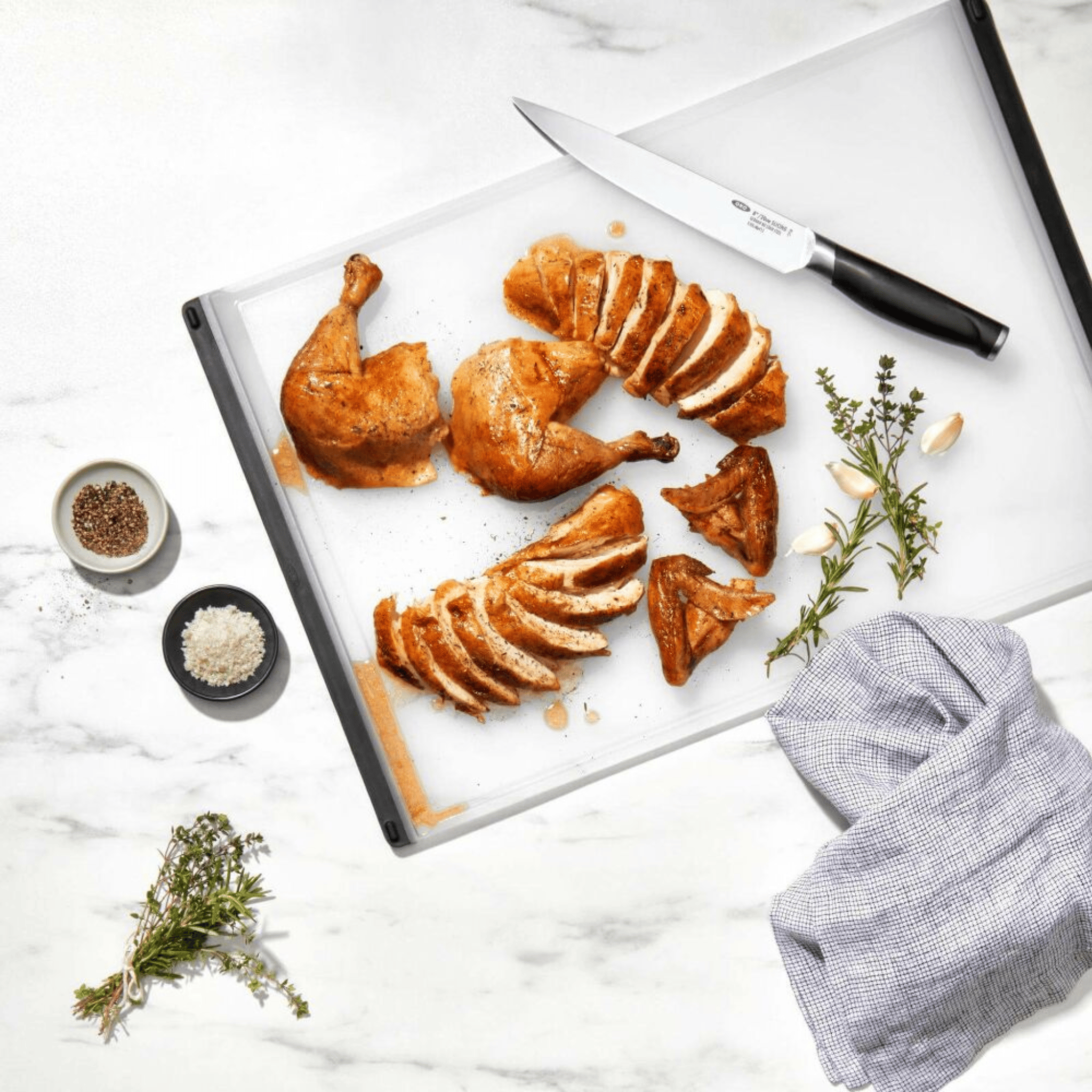 Get ambitous in the kitchen with this roomy, non-porous board, that has ample room for carving roasts and other big jobs! The OXO Good Grips Carving & Cutting Board provides plenty of space for stuffing a turkey, trussing a chicken or prepping a main dish. This double-sided board has a solid side for produce and a grooved side for meat, plus a drip catcher with easy-pour corners to take care of liquid run-off. Soft, tapered edges double as a comfortable handle, while non-slip feet keep the board in place as you slice.