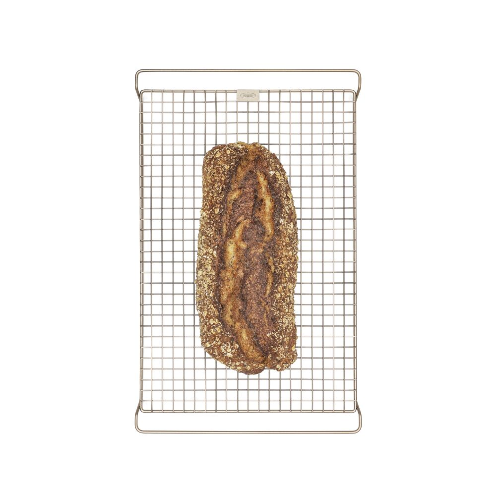 This multi-purpose rack is a handy companion for baking and cooling! Bake crispy bacon, or cool your latest creation on this strong, non-stick, stainless steel rack. The wire pattern is designed for optimal airflow, providing quick cooling even baking. The generous handles allow you to transfer your culinary creations with ease. Rack fits standard half-sheet pans.