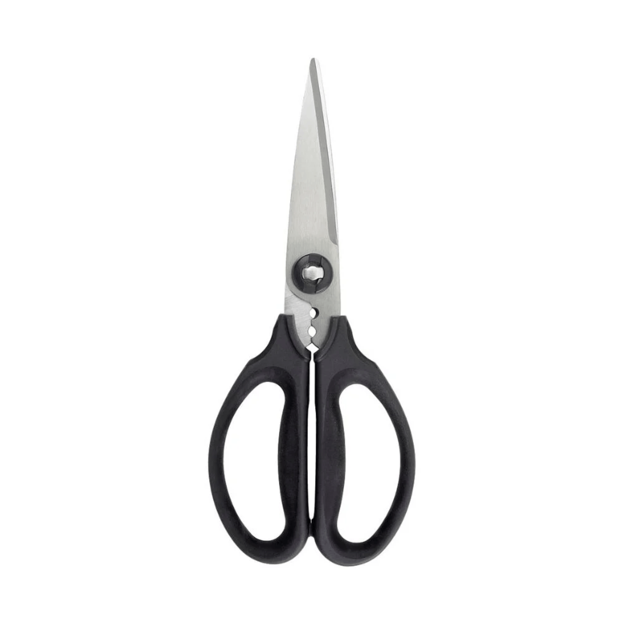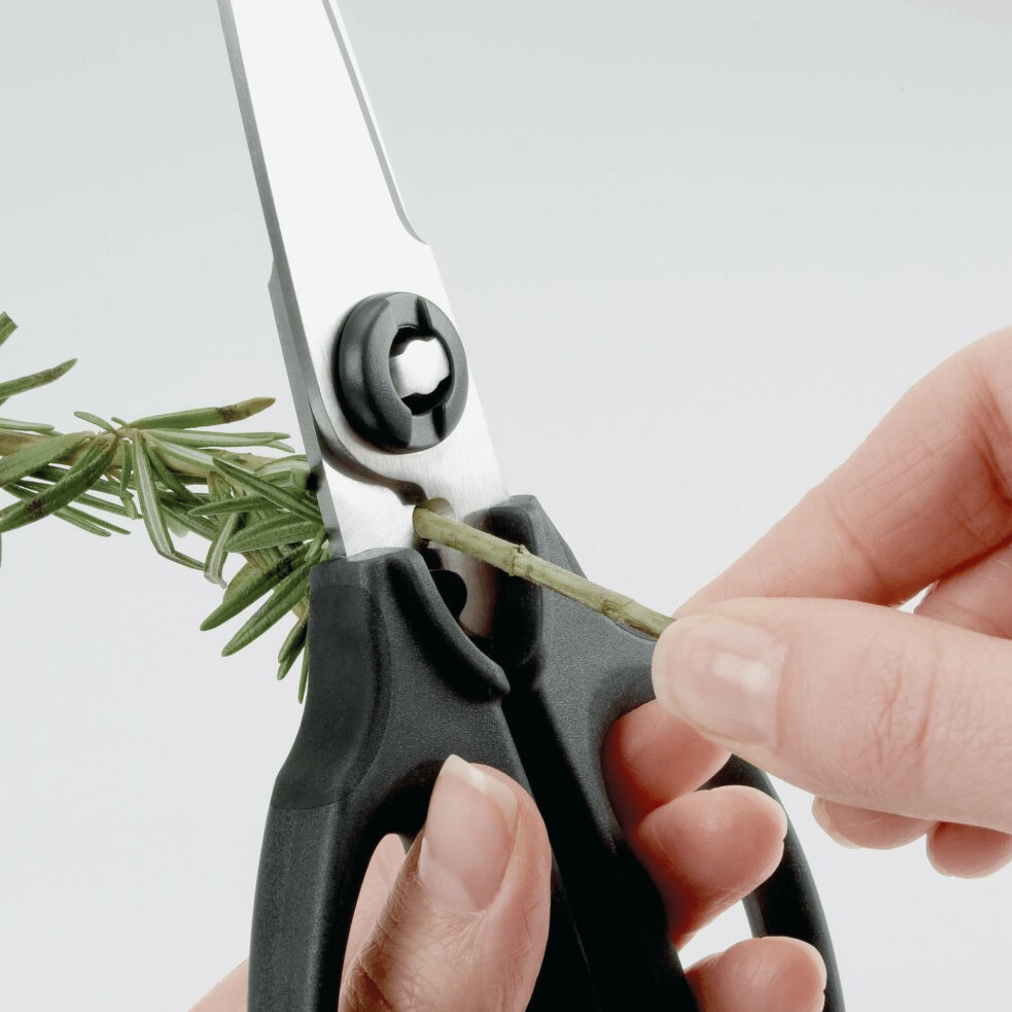 A cut above the rest, you'll want to keep these Kitchen & Herb Scissors handy for cutting meat, veggies, twine and more! The soft, ergonomic handles feature cushioned pads to absorb pressure. The herb stripper above the handles removes fresh herbs from tough stems, and the micro-serrated blades separate for easy cleaning.