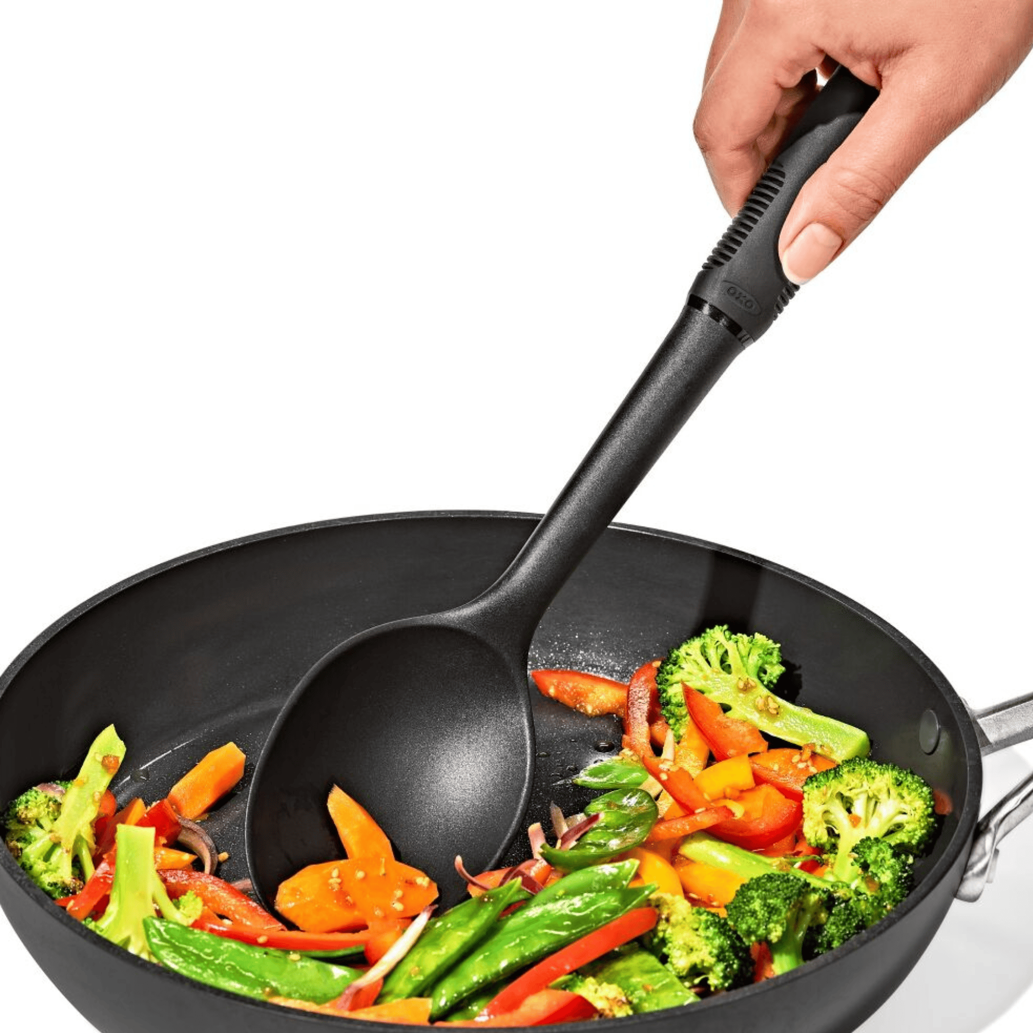 Designed for non-stick friendly straining, the Good Grips Nylon Spoon is perfect for stirring soups, sauces, stews and chili. Heat resistant up to 450°F and won't scratch non-stick cookware, you'll reach for this spoon time after time. *OXO does not use recycled black plastics in their cookware