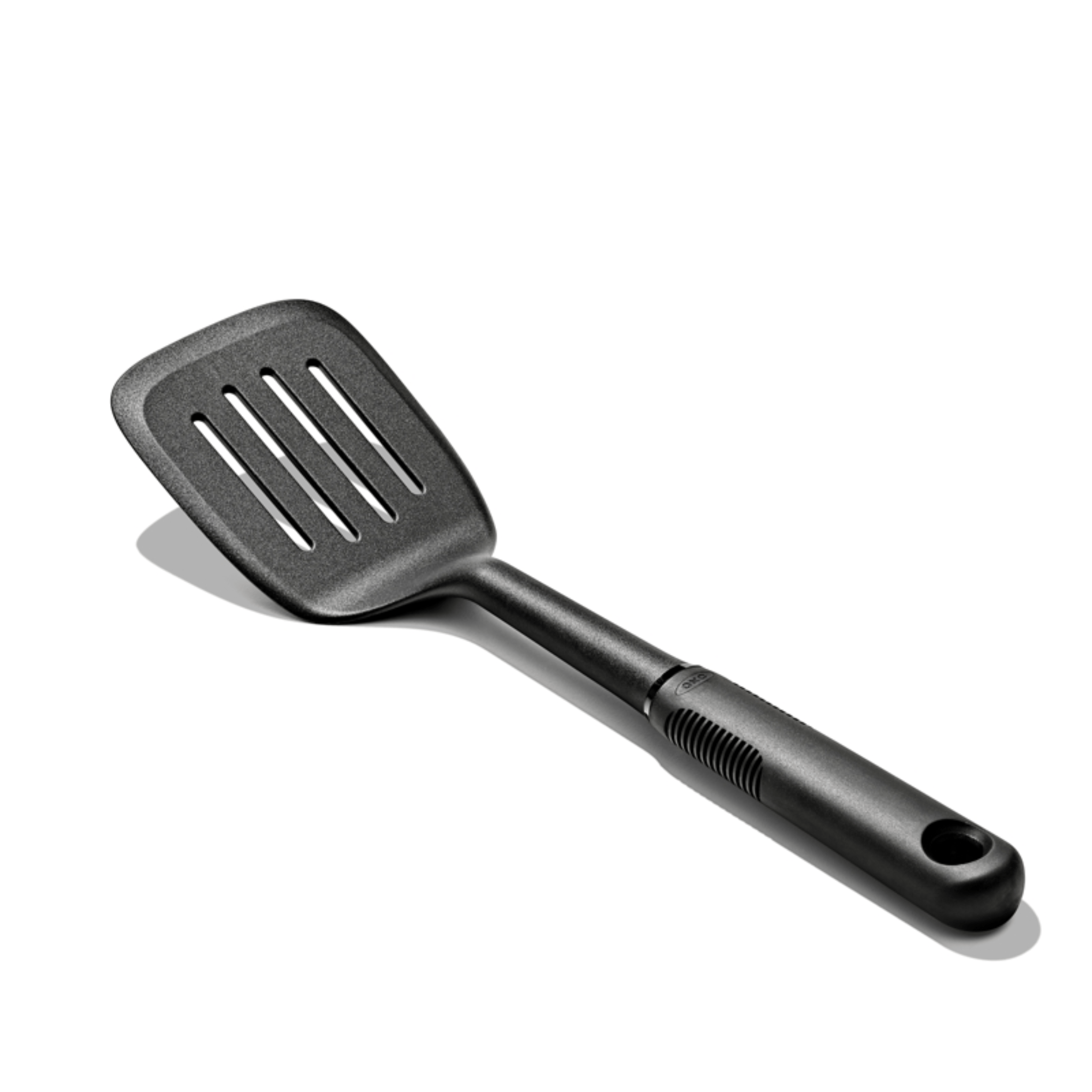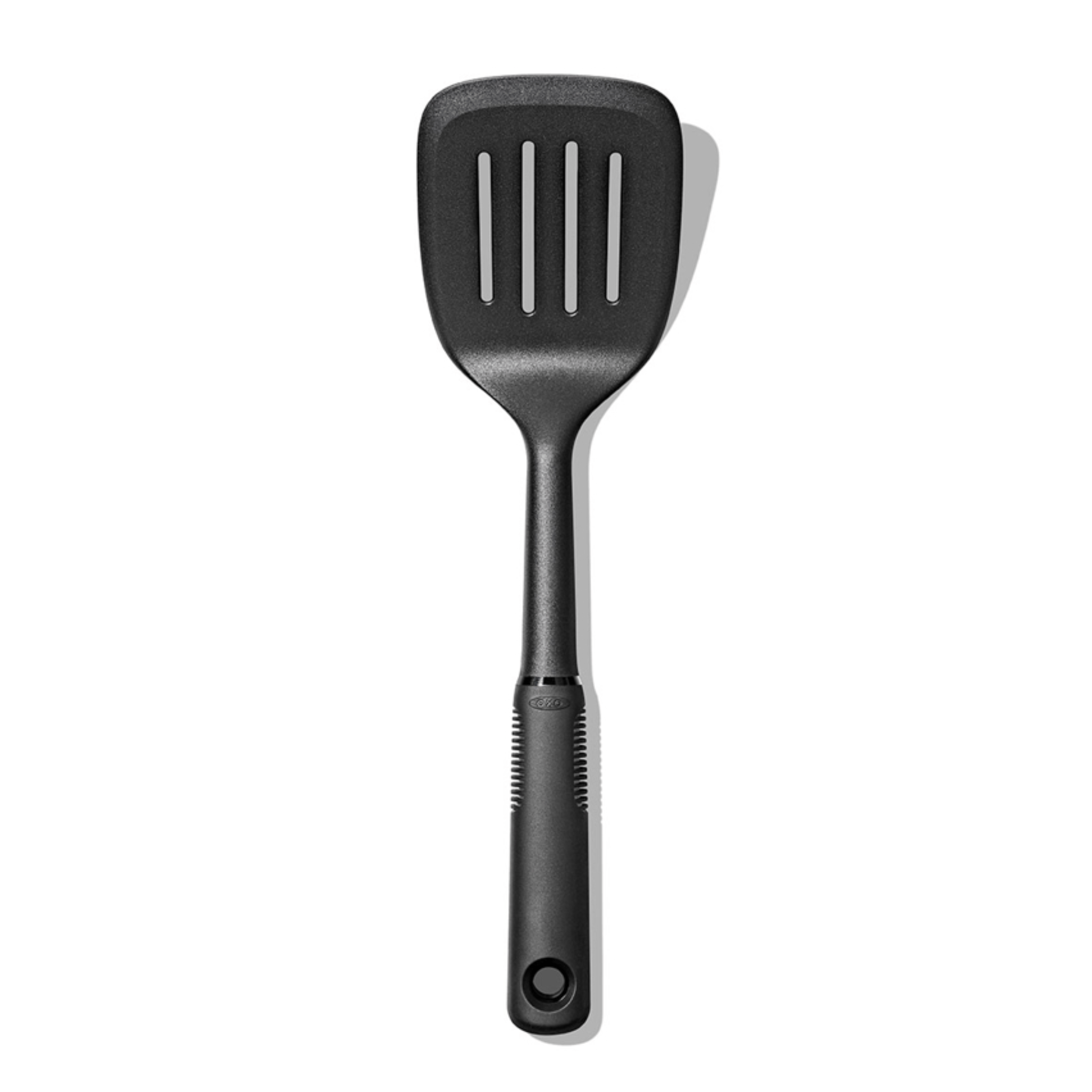 Designed for non-stick friendly flipping, the Good Grips Nylon Turner has a broad surface for easy flipping of eggs, grilled cheese and more. Heat resistant up to 450°F and won't scratch non-stick cookware, you'll reach for this verstile utensil time after time. *OXO does not use recycled black plastics in their cookware