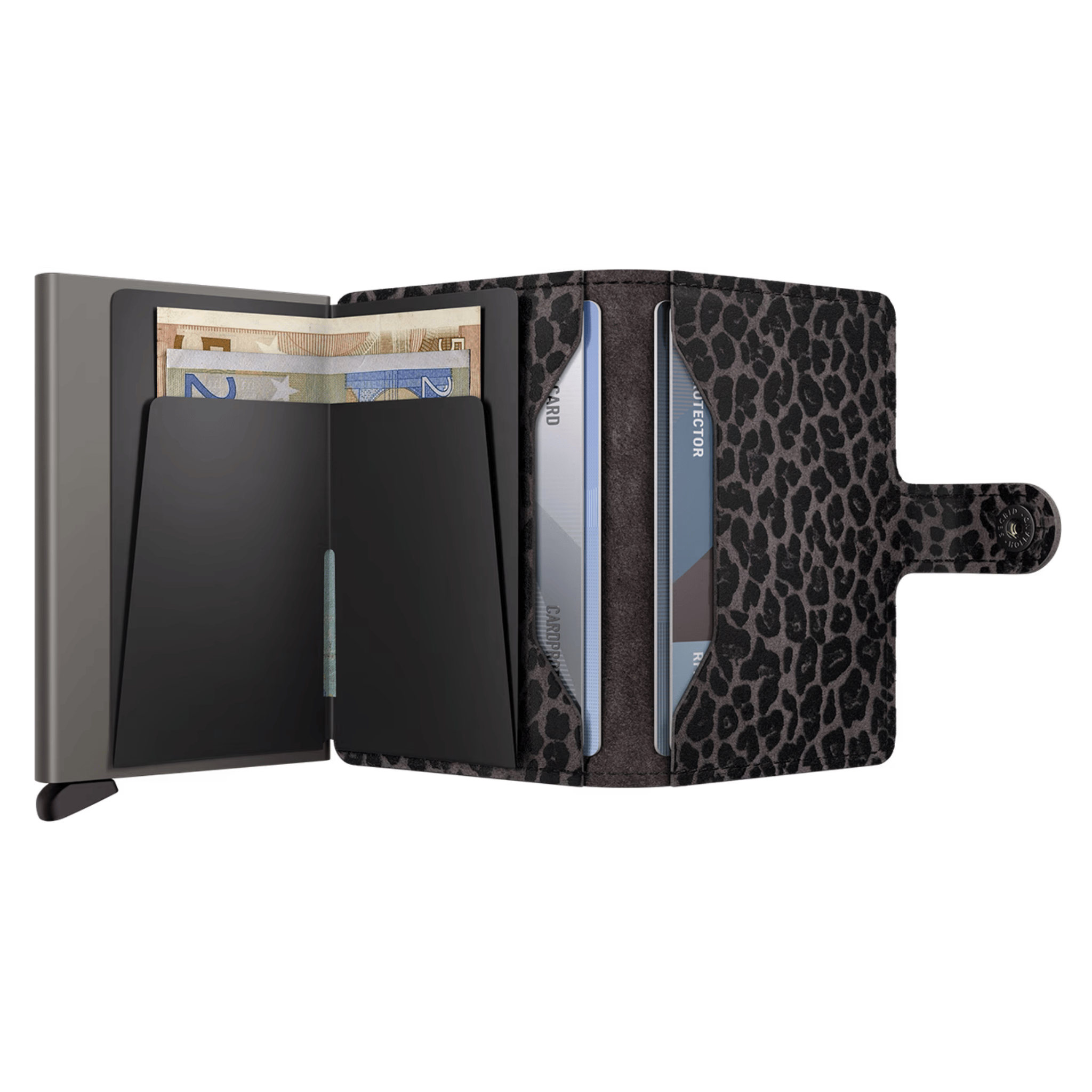 A modern, cool grey version of a classic leopard print, the Leo MiniWallet features a delicate flock print, giving it a soft, suede-like, more expandable texture. The anodized aluminum CardProtector inside is a compact design that keeps your chip cards safe from RFID scanners and identity theft. With one click all cards cascade out, making selecting the right one a breeze.