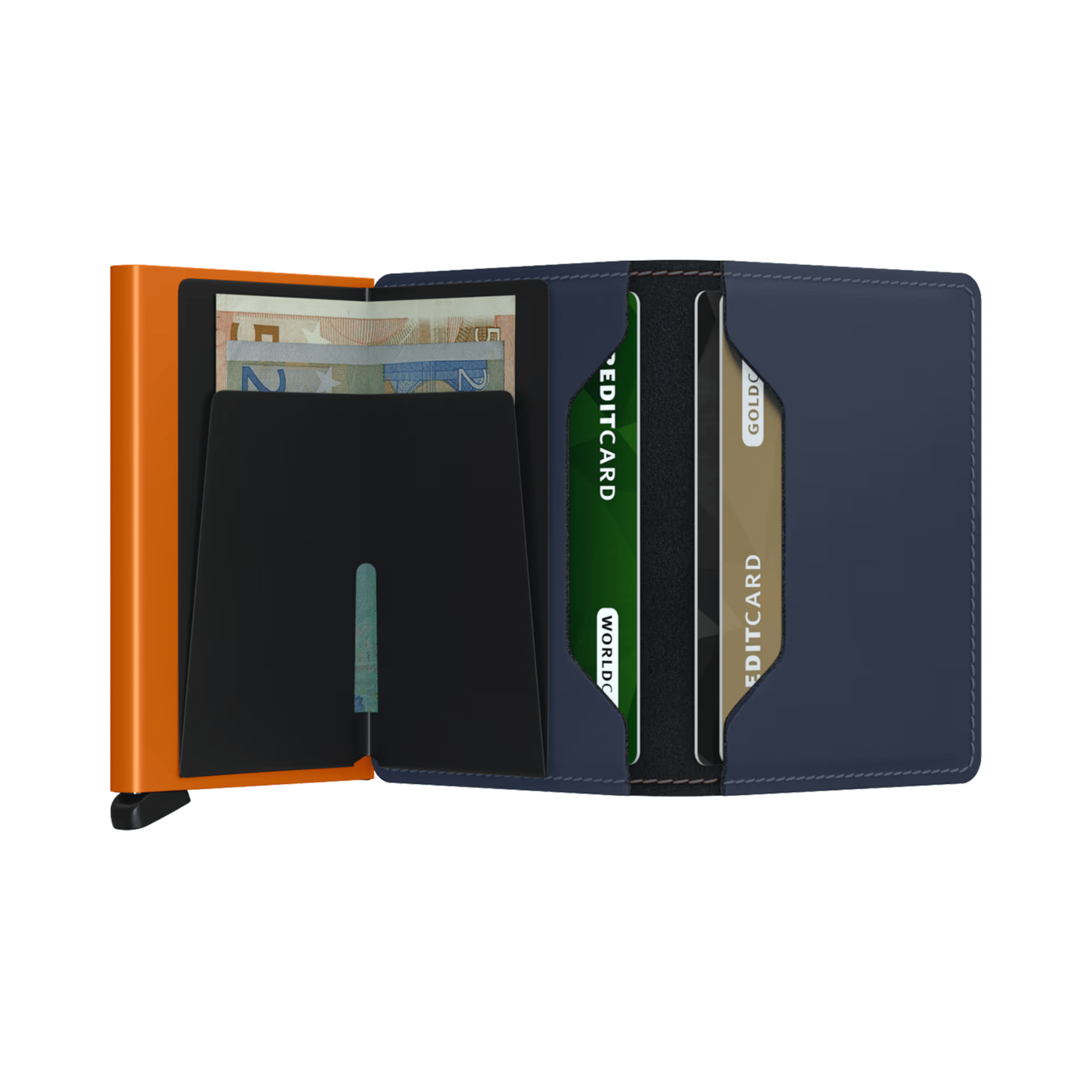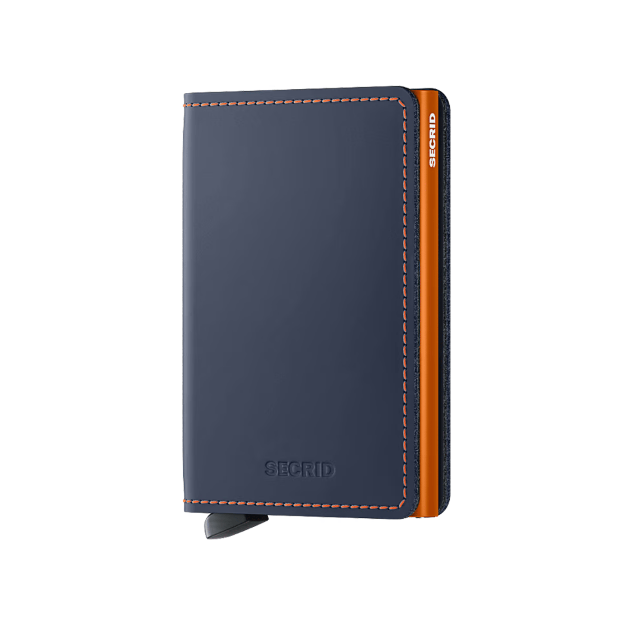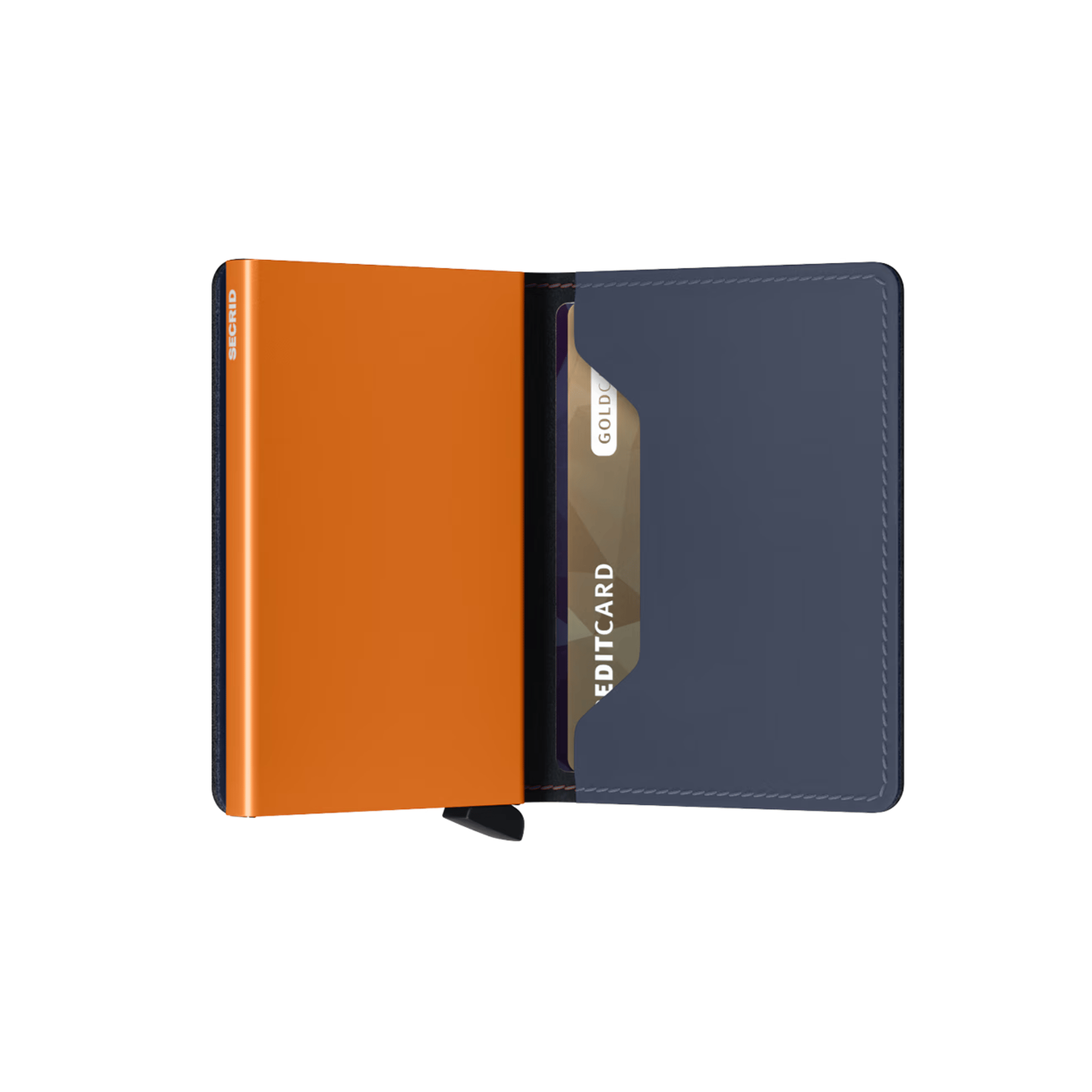The SlimWallet in Matte Nightblue features a flash of colour, with bright orange stitching on the smooth and rugged matte finish that can withstand the hustle and bustle of everyday life. The orange CardProtector completes the look and keeps your chip cards safe from RFID scanners and identity theft. With one click all cards cascade out, making selecting the right one a breeze. The open leather exterior is designed extra-wide to accommodate extra cards, cash and receipts.