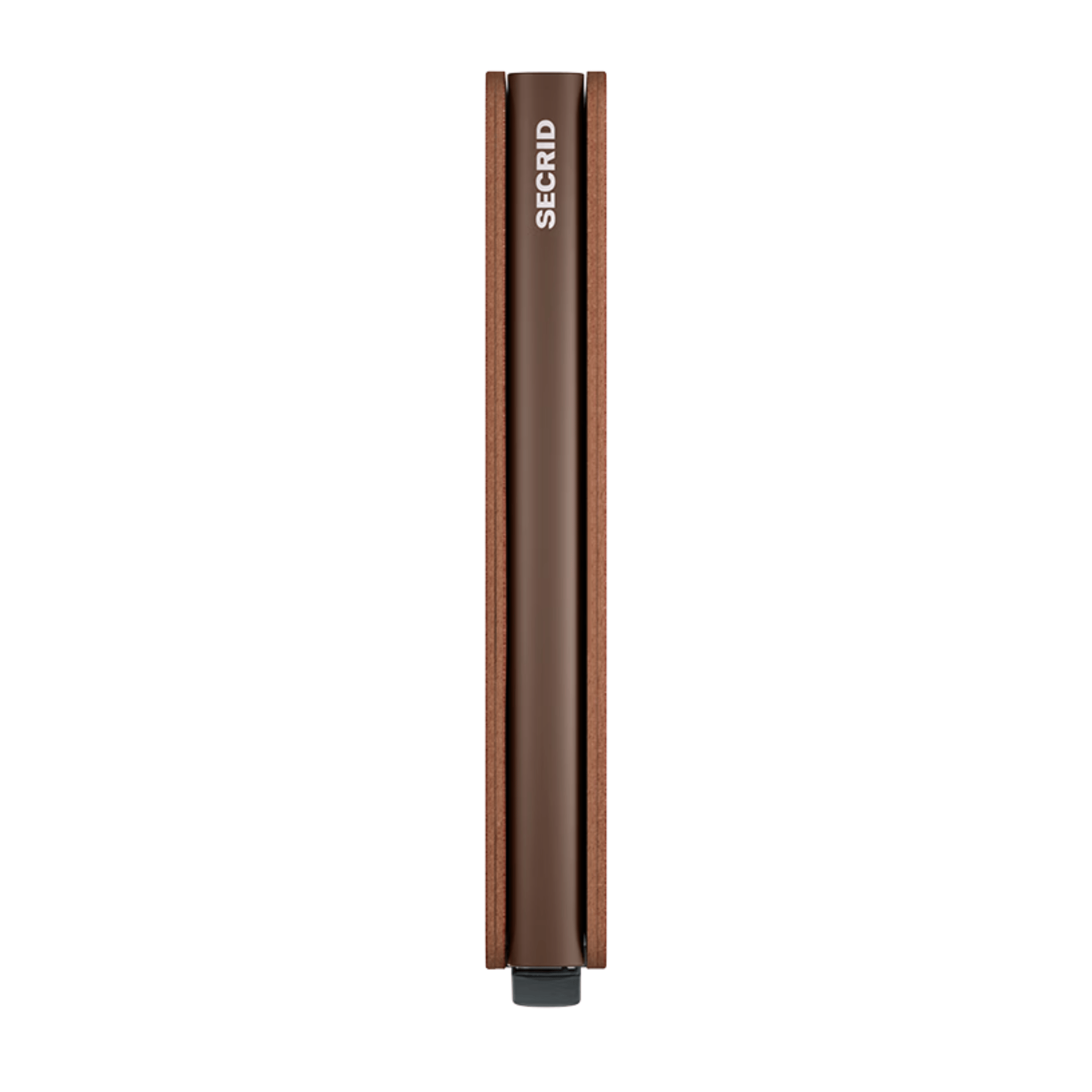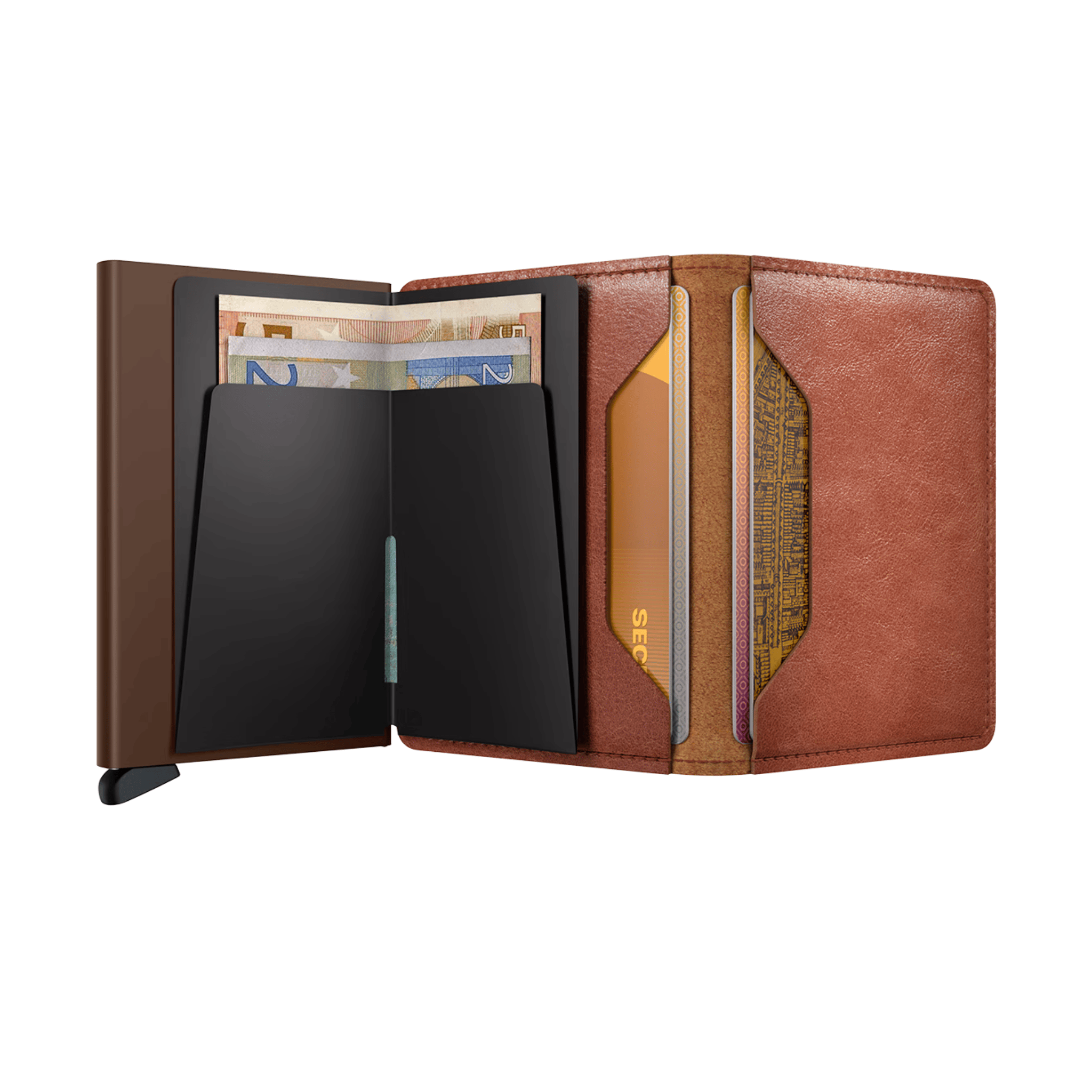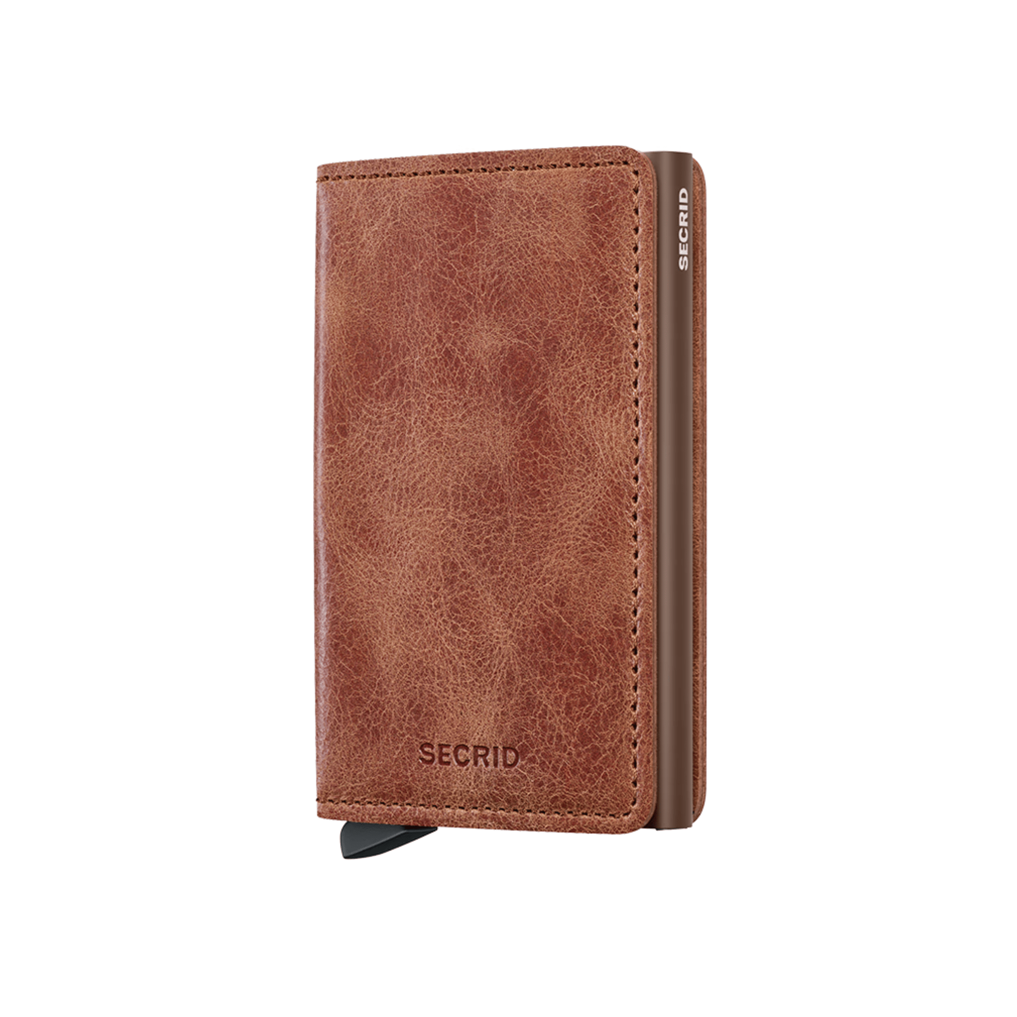 The rich warmth of the Secrid SlimWallet in Vintage Cognac has a carefully abraded surface and a wax finish that gives the leather a stonewashed, lived-in patina that just gets better over time. This pocket-sized wonder is complemented with a brown anodized aluminum CardProtector that keeps your chip cards safe from RFID scanners and identity theft. With one click all cards cascade out, making selecting the right one a breeze. The open leather exterior is designed extra-wide to accommodate extra cards, cash and receipts.