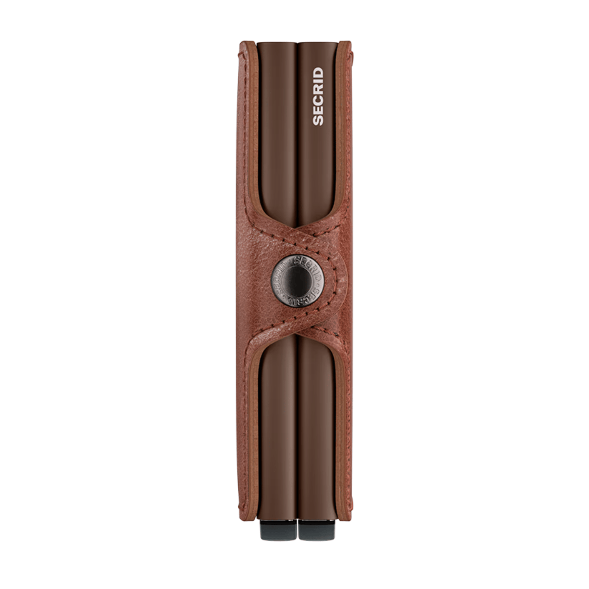 Carry double the cards with a larger capacity TwinWallet. The rich, Cognac leather has a carefully abraded surface and a wax finish that gives the leather a stonewashed, lived-in patina that just gets better over time! Two brown anodized aluminum CardProtectors keeps your chip cards safe from RFID scanners and identity theft. With one click all cards cascade out, making selecting the right one a breeze.