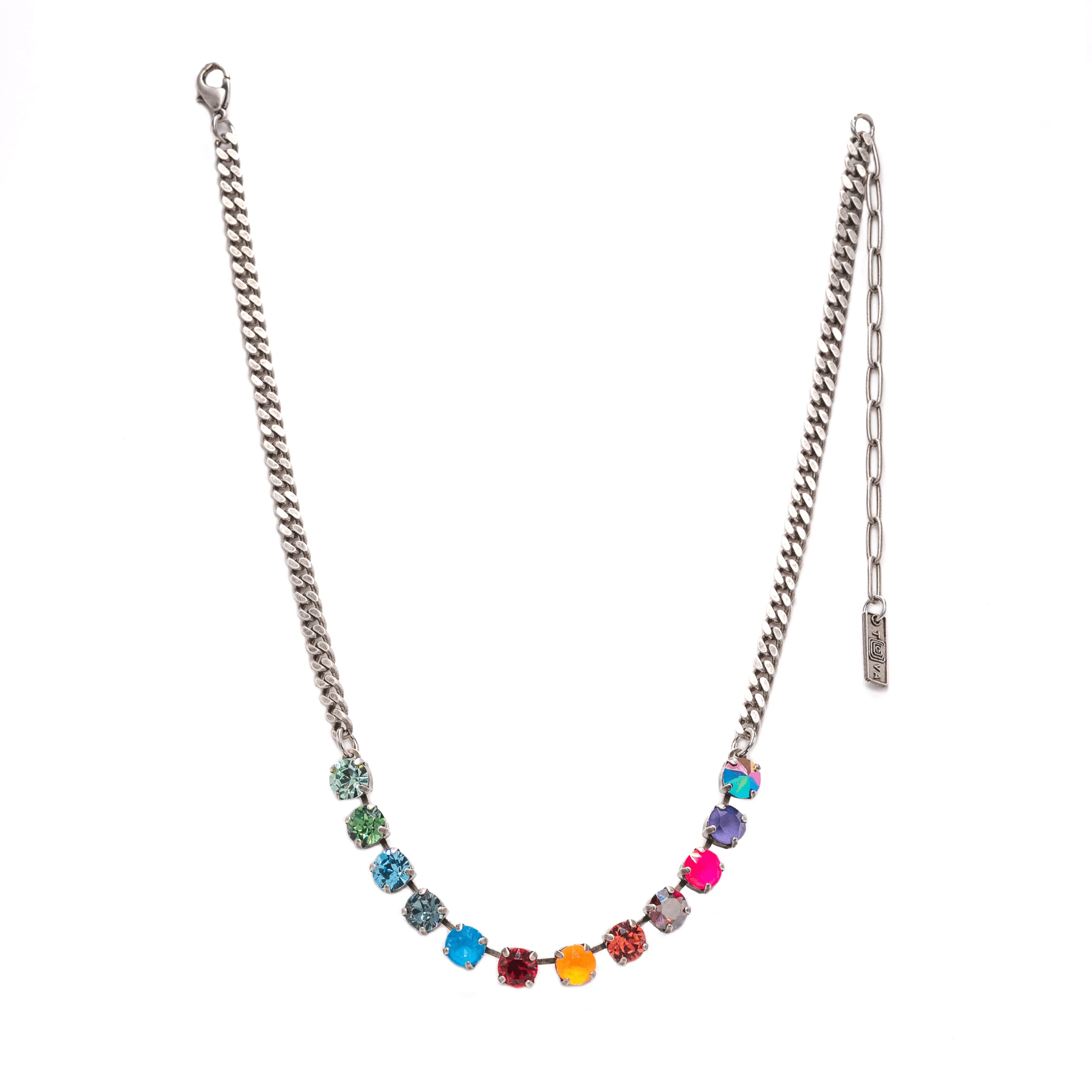 Glimmer and shine in TOVA's Mini Oakland necklace in frosty silver, with a rainbow of colourful crystals! This stunning, multi-coloured necklace is handmade in Canada from silver-plated brass, lined with glittering crystals. Perfect for any occasion, this necklace has you covered from day to night.