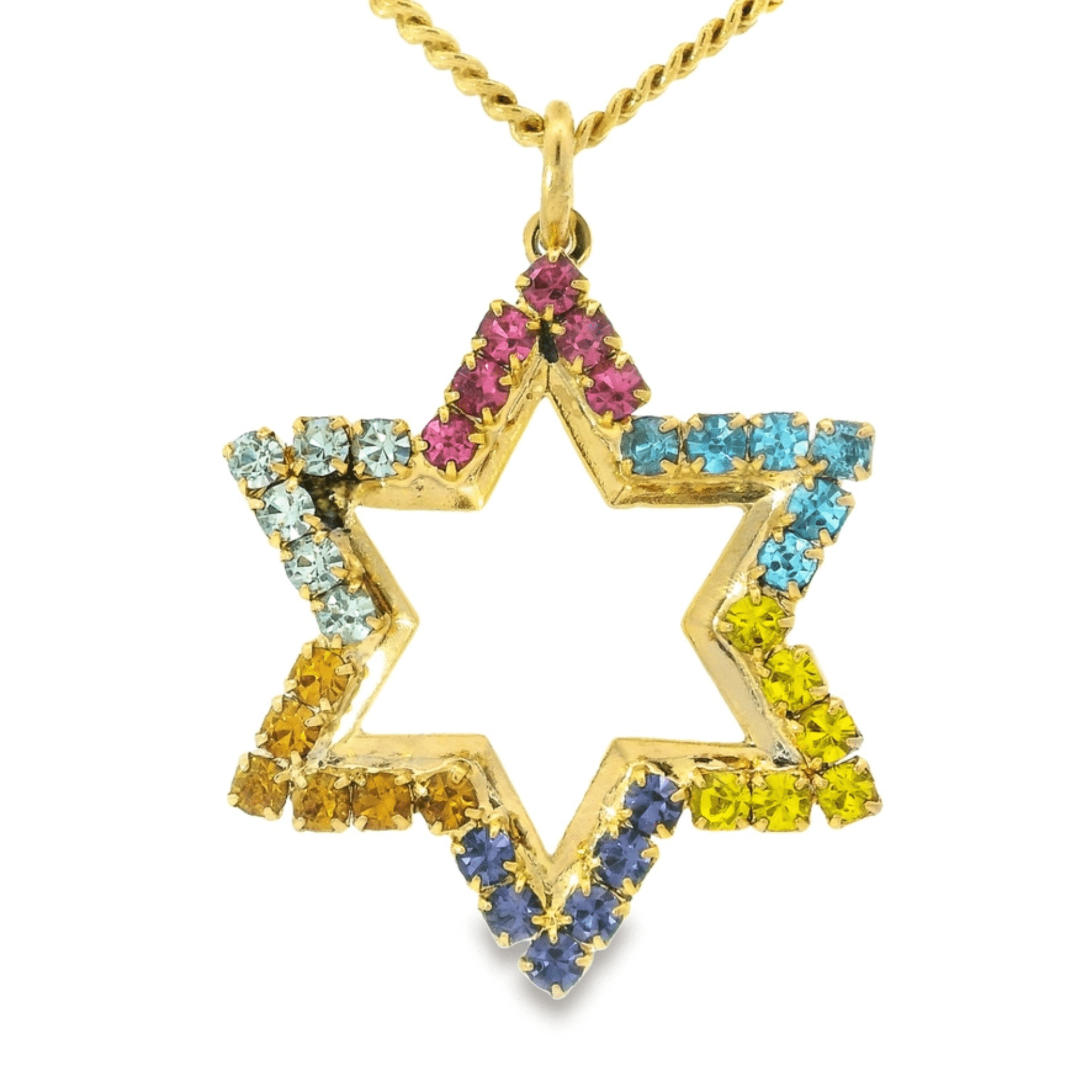 The bright and funky neon Star of David necklace features antique gold plating with high-quality crystals, and a bold, hand-painted enamel design. Wear it on it's own, or makes a great layering piece! Made in Canada with love.