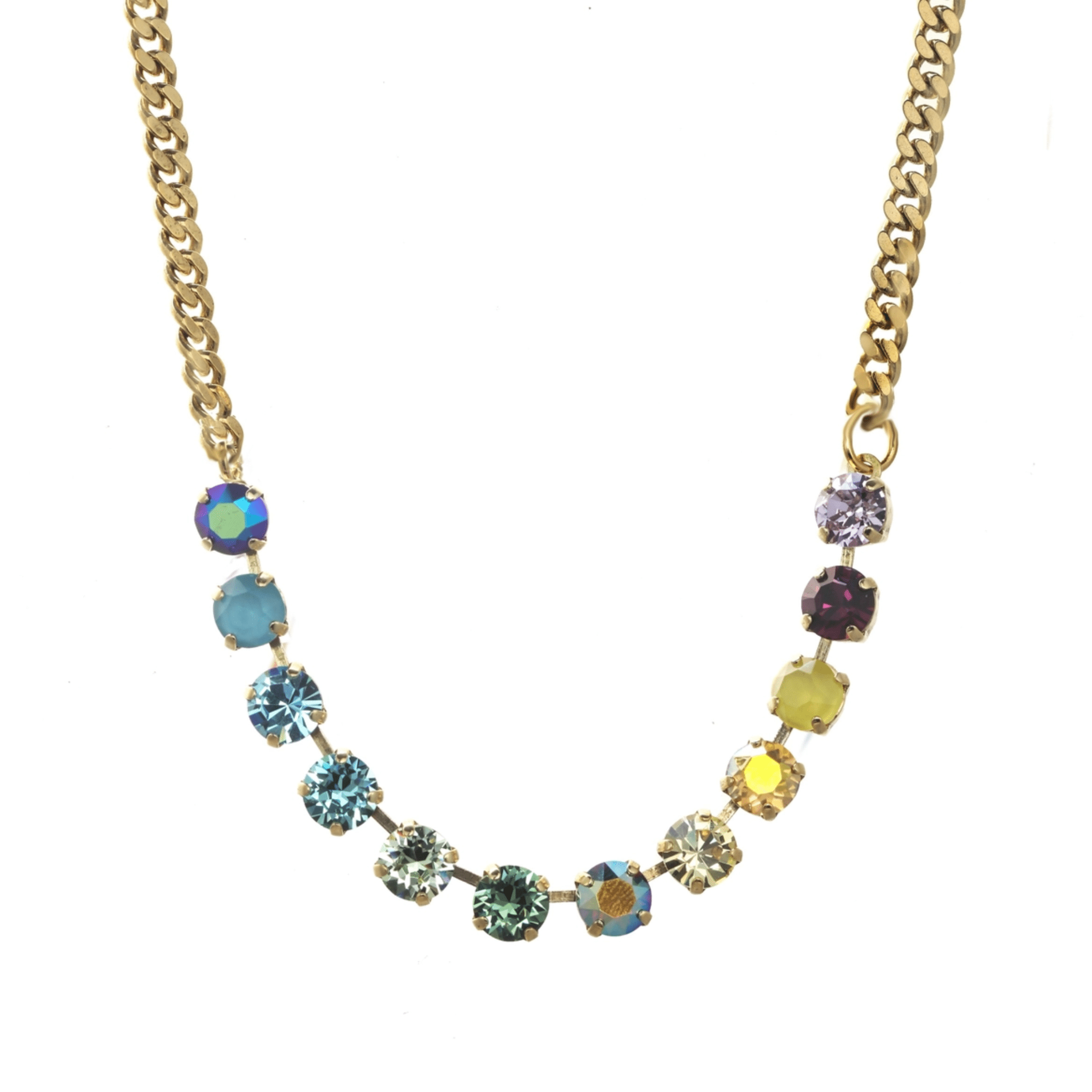 Warm gold and gorgeously glittering crystals come together in TOVA's Mini Oakland Rainbow necklace. Available in 2 colour ways, this stunning, multi-coloured necklace is handmade in Canada from antique gold-plated brass, lined with high-quality crystals. Perfect for any occasion, this necklace has you covered from day to night.