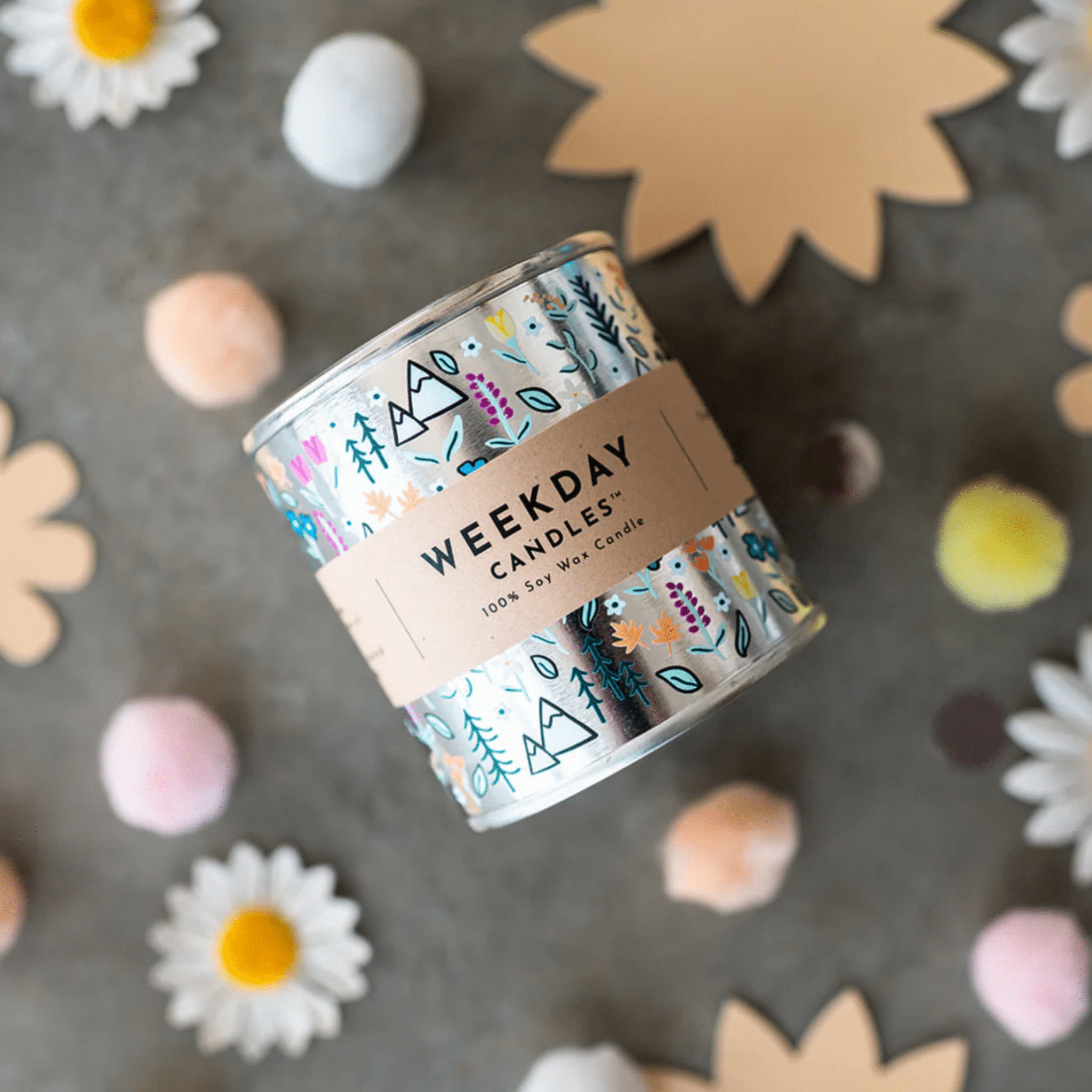 Take a morning walk in the woods with the Mountain Air candle. It smells like a week full of possibilities - fresh, warm and woodsy - with notes of forest and sweet clove. Weekday Candles paint tins feature an adorable print, clean-burning soy wax and a crackling wood wick, for a candle that gives good looks and scents!