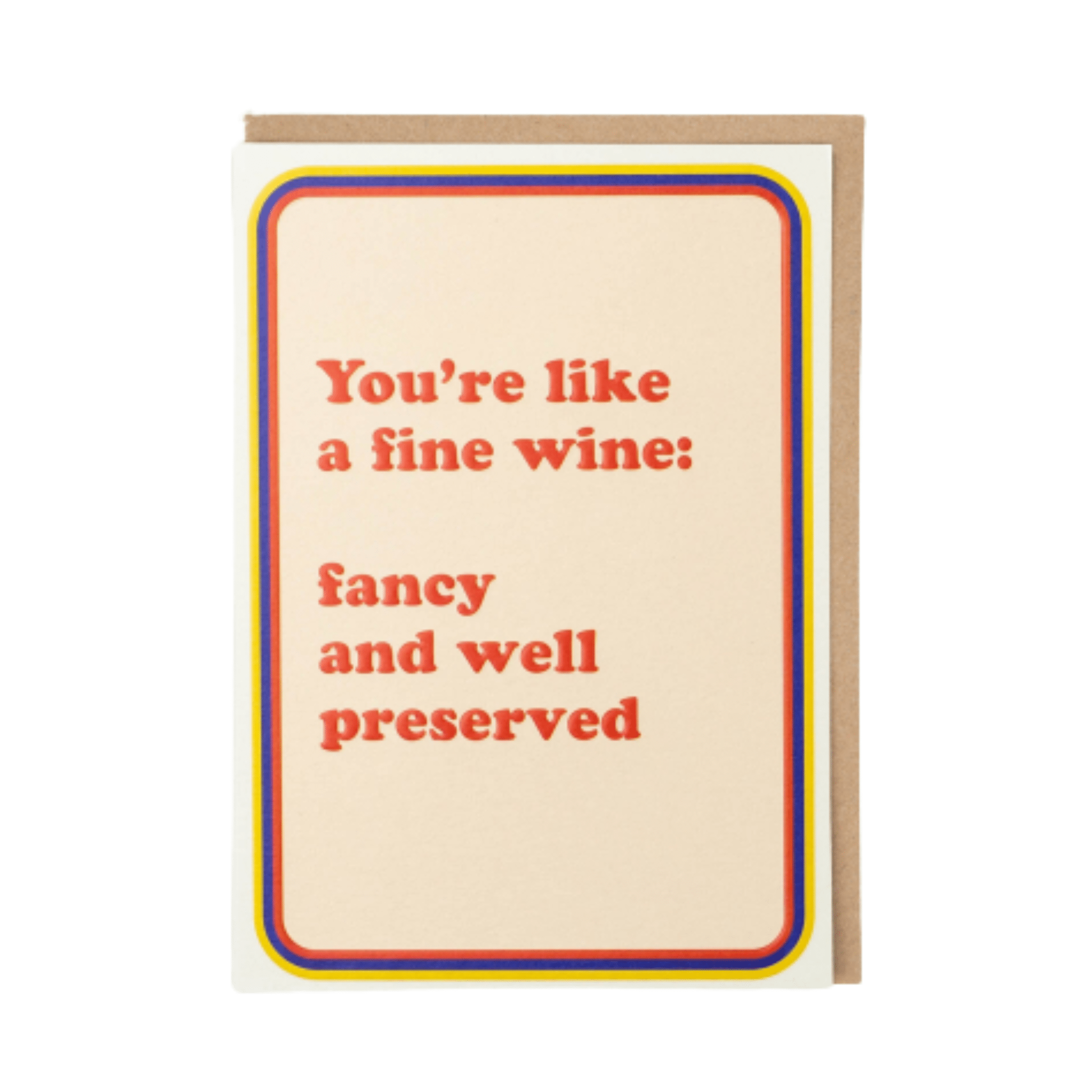 The Fine Wine card is a cheeky and admiring way to say happy birthday to someone who doesn't take life too seriously! Blank inside to personalise with your own message. For over 40 years, Cath Tate Cards have designed witty and wise cards that give vintage and retro images a sense of humour
